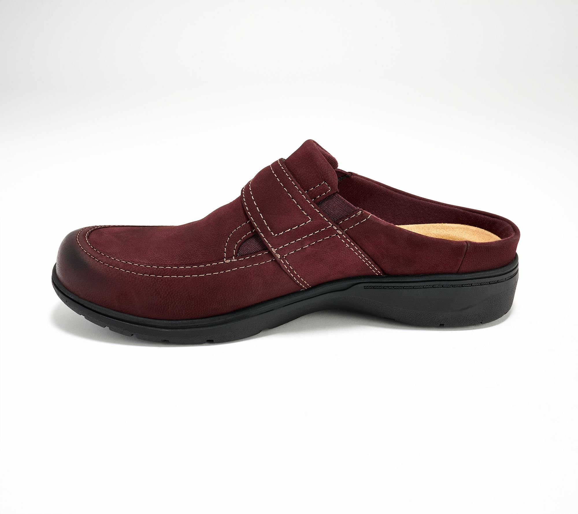 • Nubuck upper, slip-on clog style, stretch gore panel, hardware and stitch details