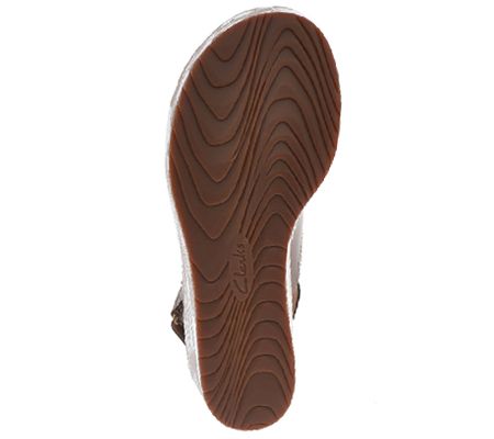 Comfy with a splash of fun! Kick your summer style up a notch with these Clarks wedge sandals. Crisscross leather straps make up the fashionable upper, while the adjustable backstrap ensures your perfect fit. Keep things comfy with padded insoles over a fun and flirty wedge heel. Pair with all your warm-weather essentials and look great throughout the season. From Clarks Footwear.