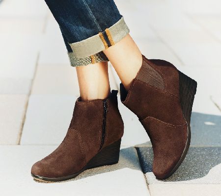 Perfect for pairing with your favorite leggings, skirts, and slacks, these fashion-forward leather ankle boots help give you that long-legged look you love--minus the high-heel wobble! Outfitted with a stacked wedge heel and textured outsole, they add just the right amount of lift while giving you long-lasting comfort you can count on.