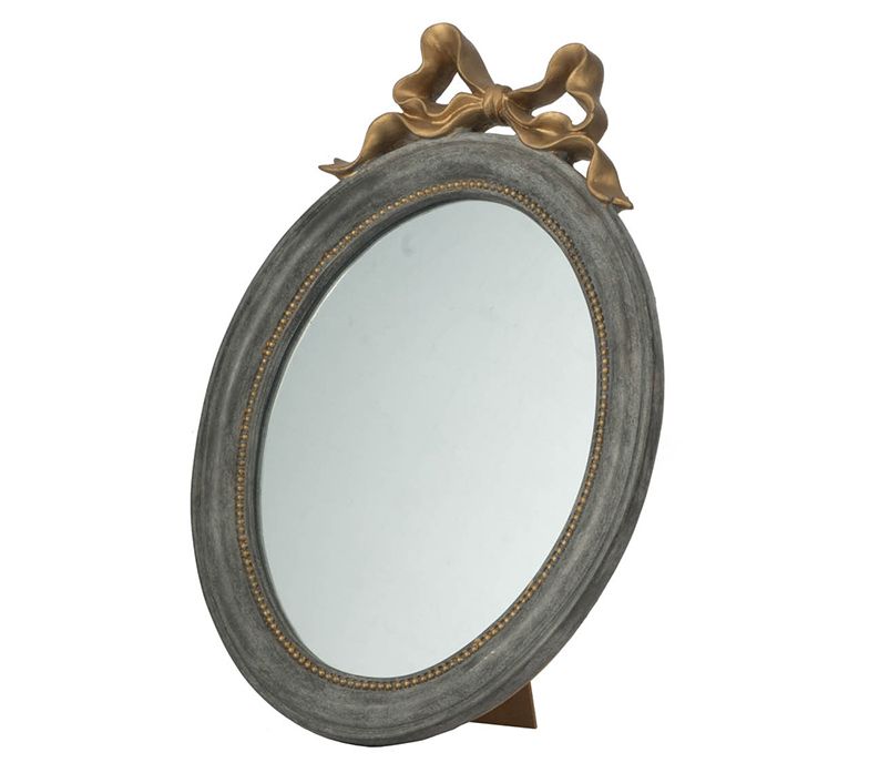 A charming ribbon ornament tops this classic oval mirror -- for hanging or tabletop display. From the Valerie Parr Hill Collection.
