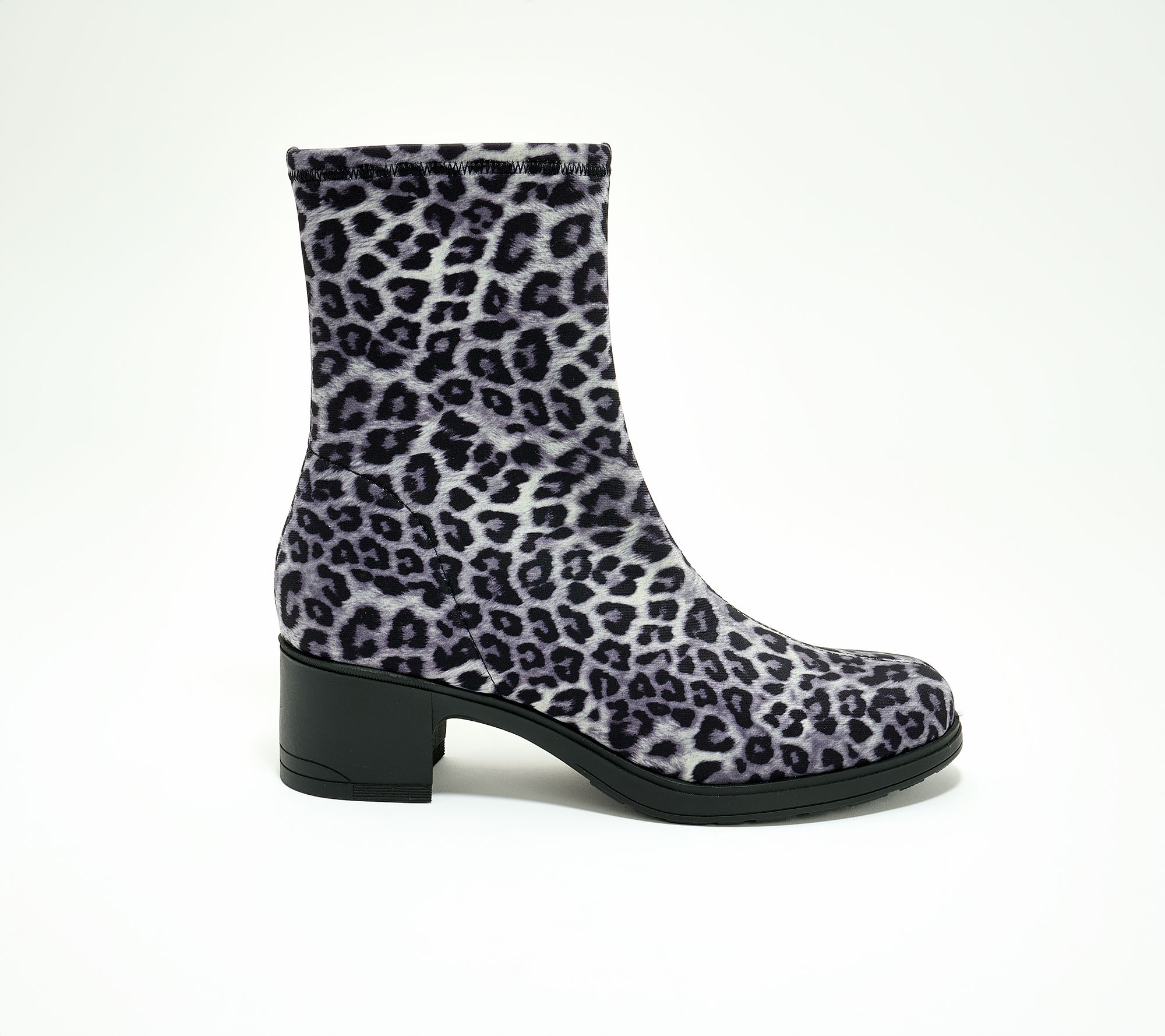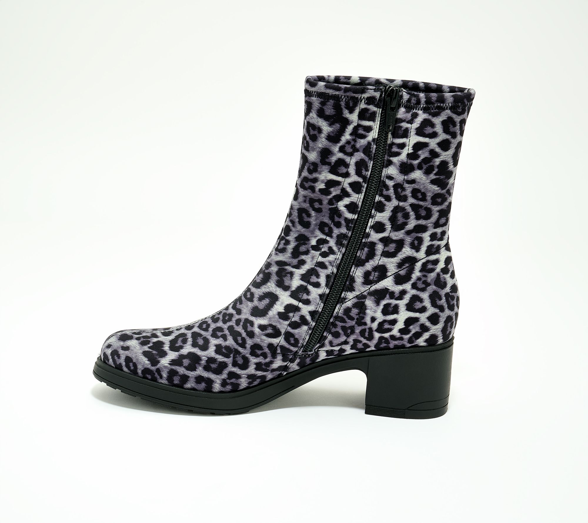 Stretch fabric upper, mid-shaft, inside zipper, almond toe