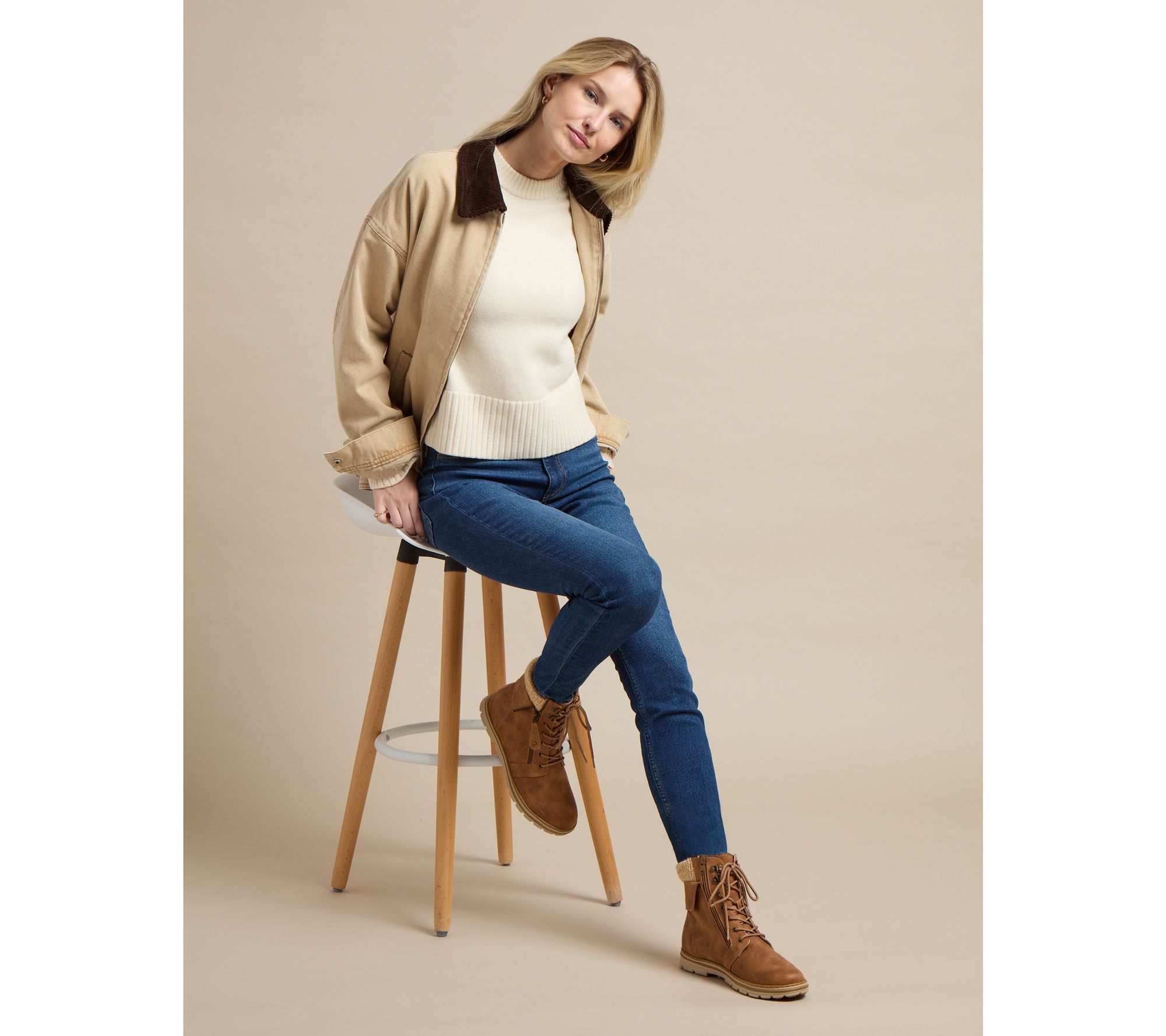 Lace-up and zip closure, knit collar, fold-down design, rounded toe