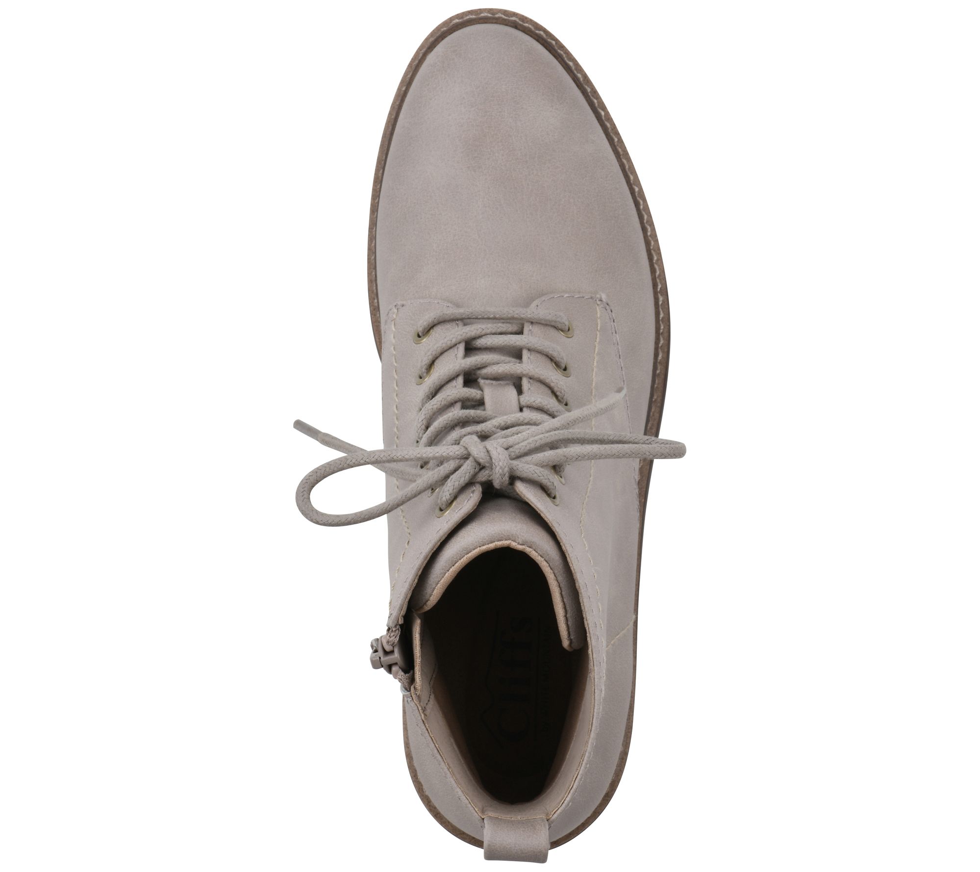 • Side zip and lace-up closures, contrast stitching, rounded toe