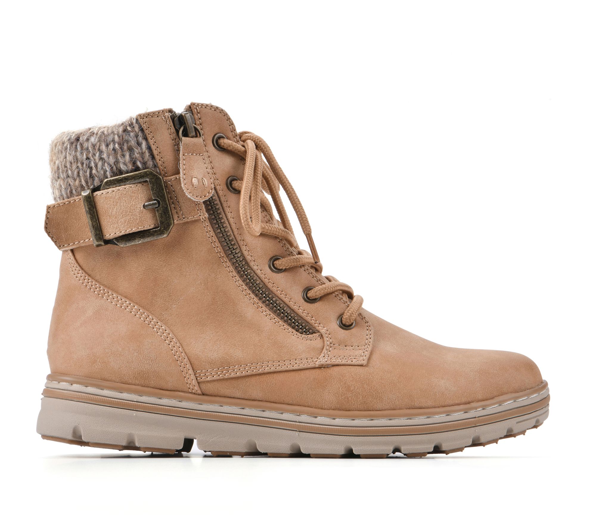 • Lace-up and side-zip closure, buckle and sweater detail, rounded toe