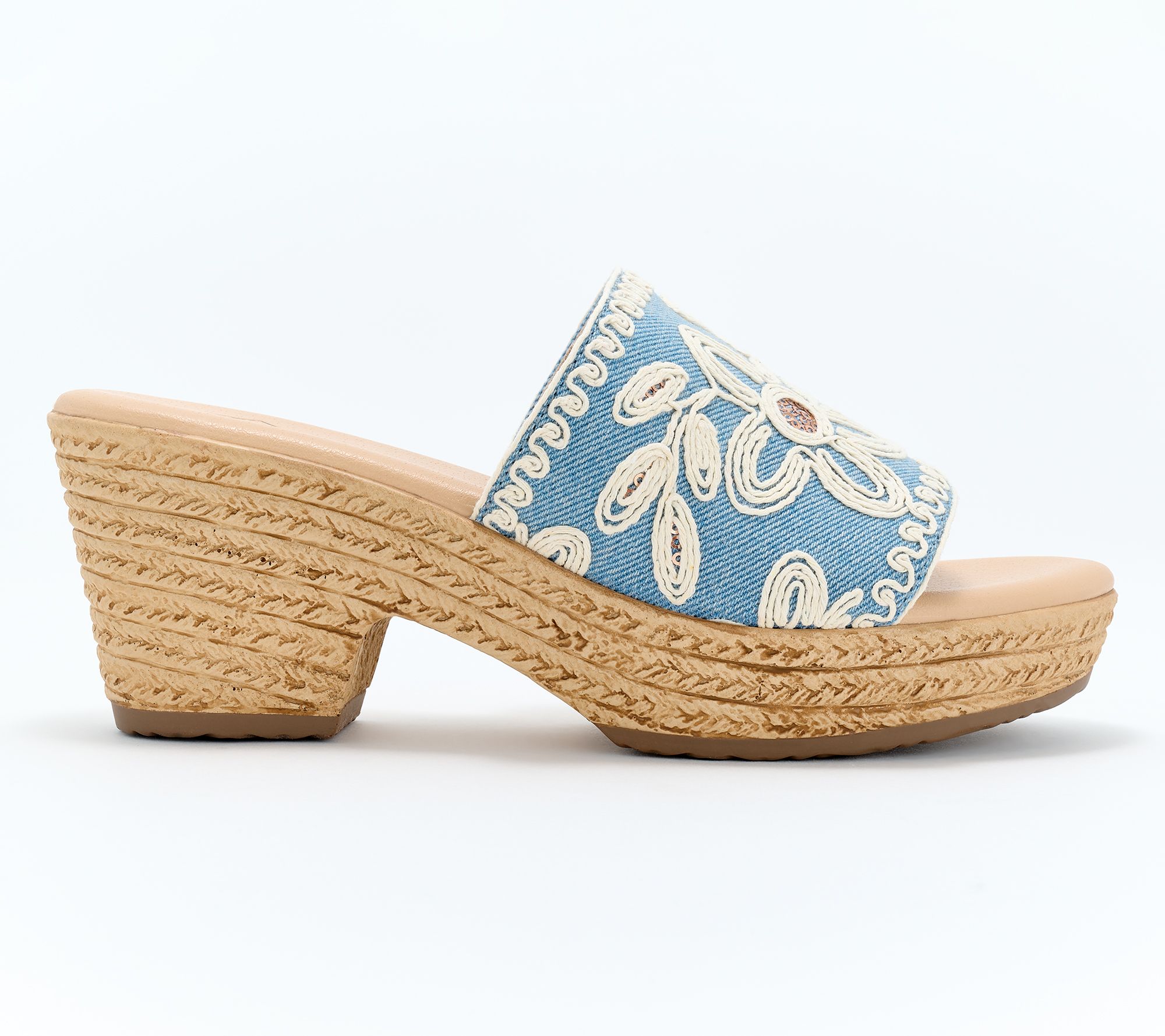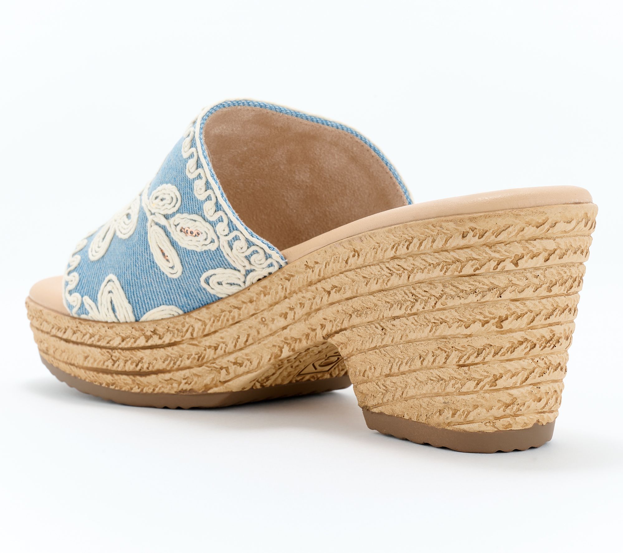 Rope-wrapped platform wedge with banded upper, floral and stone accents