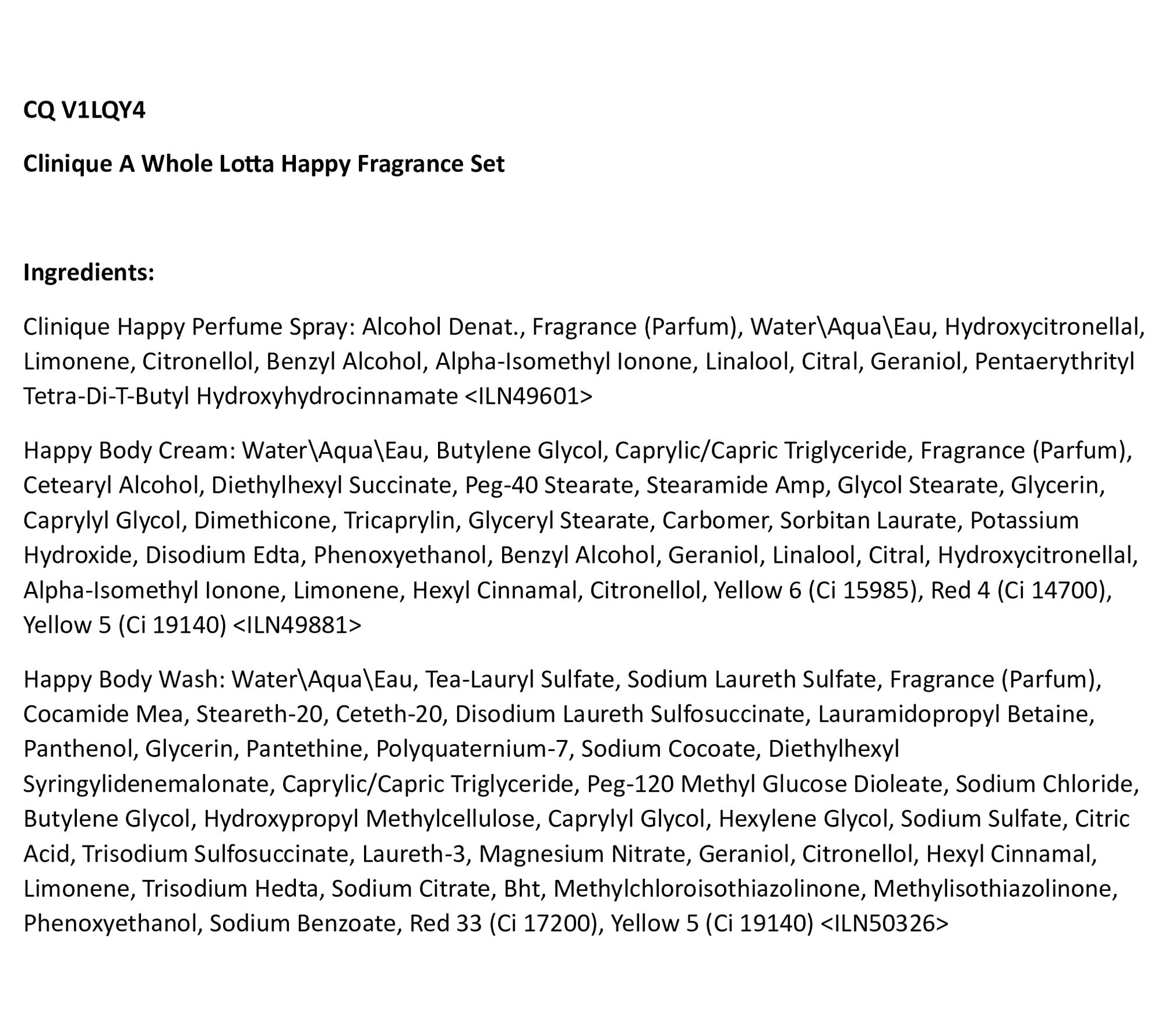 Clinique A Whole Lotta Happy Fragrance Set includes a trio of the citrus-and-floral fragrance favorite for happiness from head to toe. Happy interplays fresh, vibrant notes-ruby red grapefruit, bergamot-with soft, sensual ones-Hawaiian wedding flower, spring mimosa. With this fragrance trio, you can get Happy three ways. Refreshing Body Wash bathes you in our feel-good fragrance. Layer on rich, hydrating Body Cream and soften skin with a hint of scent. Finish with a spritz of Perfume Spray.