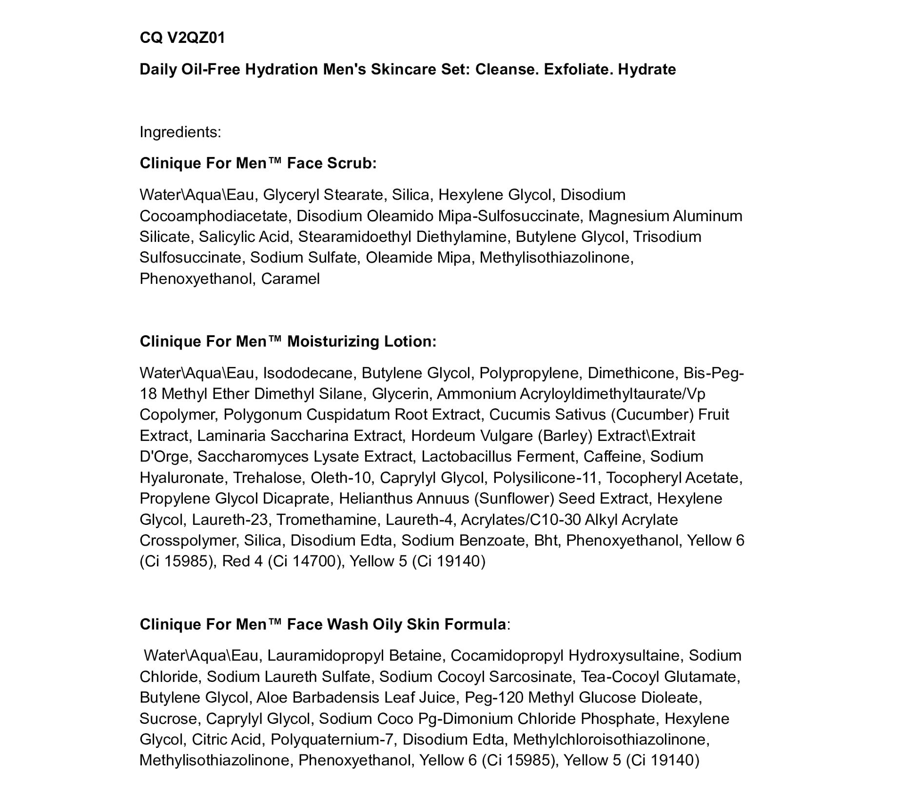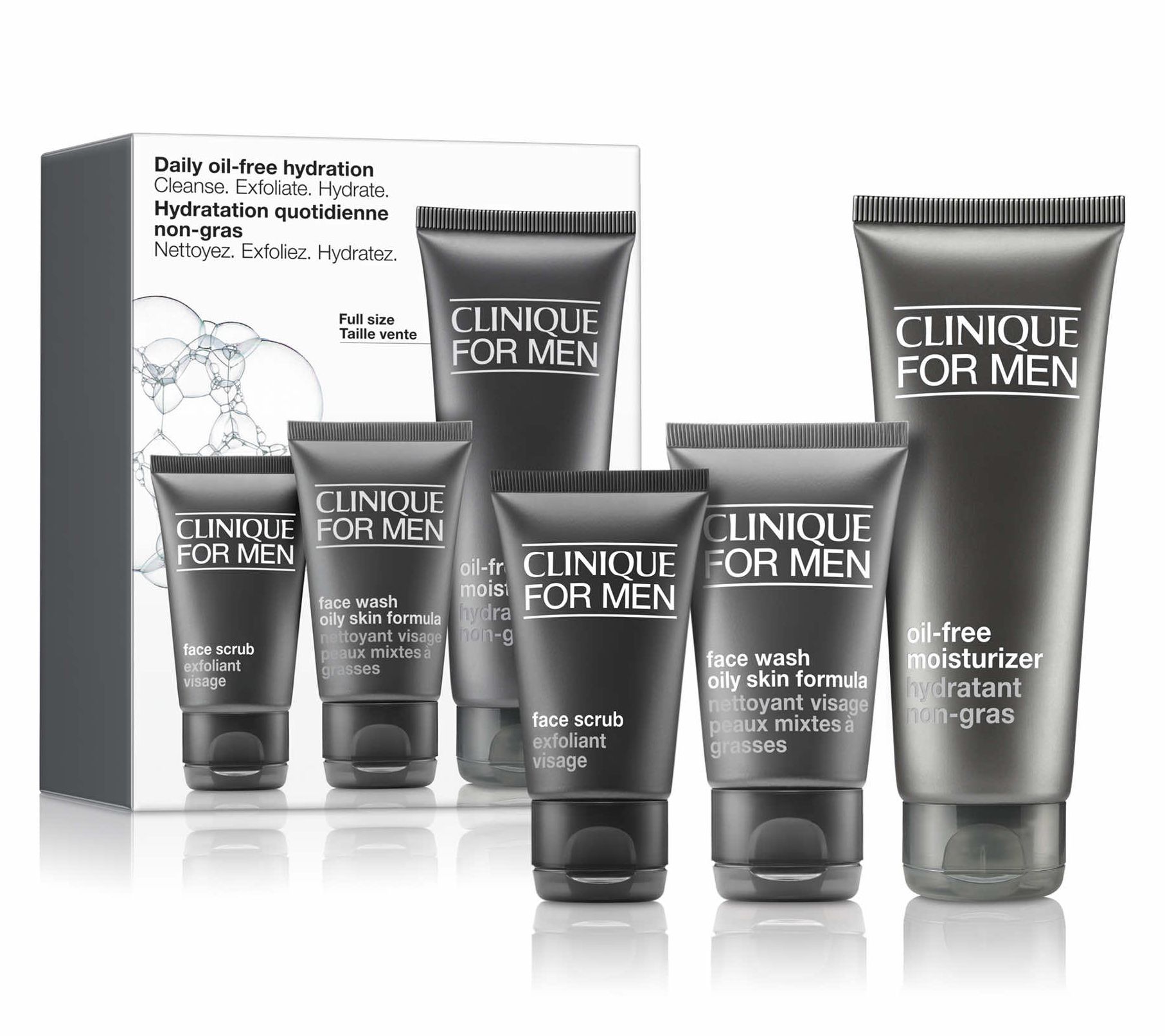All he needs to keep oily skin cleansed, exfoliated, and hydrated. This set of customized Clinique formulas helps keep oilier skin types cleansed and fresh. Clinique for Men Face Wash Oily Skin Formula thoroughly cleanses and removes excess oil. Clinique for Men Face Scrub revives and smooths skin to clear the way for a close shave. Clinique for Men Oil-Free Moisturizer delivers lightweight, oil-free hydration plus skin barrier ingredients.