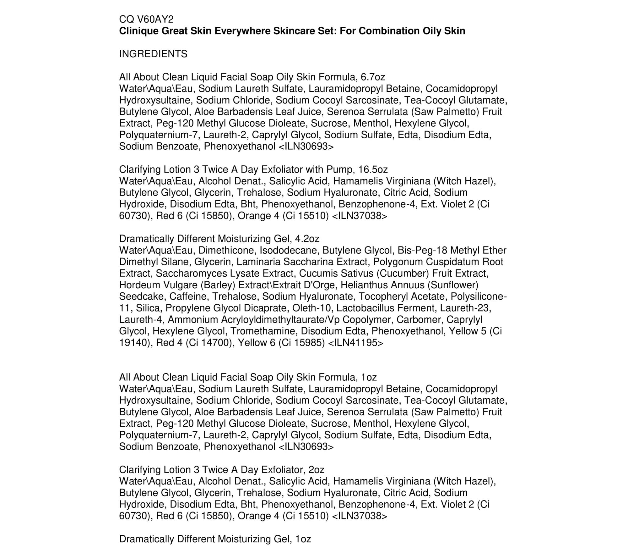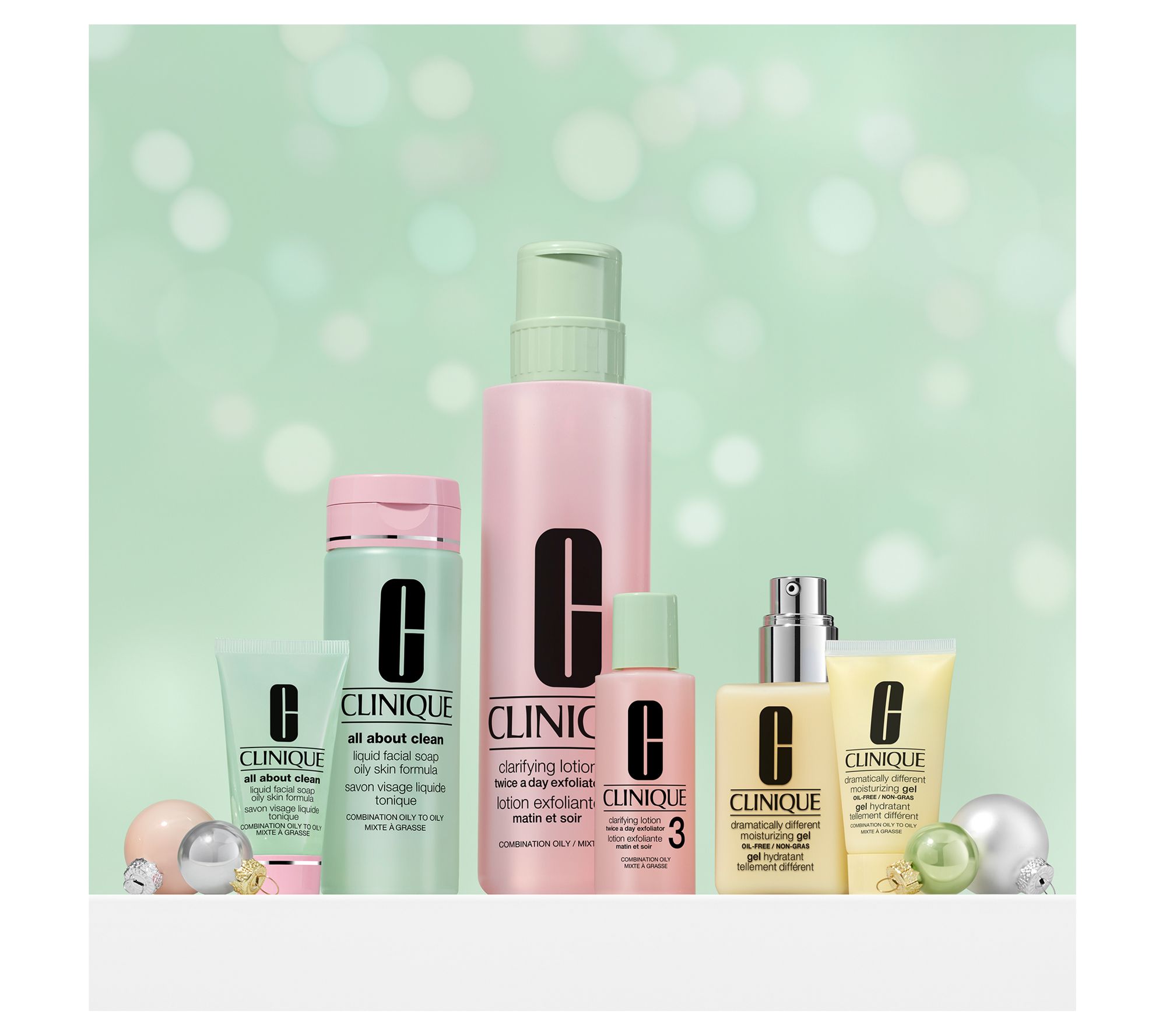 Our most-wanted holiday set. Clinique's three signature steps for glowing skin-one set for home, one for travel. Customized for oilier skin types. Ultra-hydrating 3-Step skincare-in full and travel sizes-to give oilier skin exactly what it needs to be great skin. All About Clean Liquid Facial Soap Oily cleanses gently. Clarifying Lotion helps clear away excess oil and keep pores clear. Dramatically Different Moisturizing Gel hydrates. Paraben-free, Phthalate-free, Fragrance-free. Set Includes (1) All About Clean Liquid Facial Soap Oily Skin Formula, 6.7oz (1) Clarifying Lotion 3 Twice A Day Exfoliator with Pump, 16.5oz (1) Dramatically Different Moisturizing Gel, 4.2oz (1) All About Clean Liquid Facial Soap Oily Skin Formula, 1oz (1) Clarifying Lotion 3 Twice A Day Exfoliator, 2oz (1) Dramatically Different Moisturizing Gel, 1oz How To Use All About Clean Liquid Facial Soap Oily Skin Formula- Use twice a day, morning and night. Lather between palms with lukewarm water. Massage over makeup-free face and neck. Rinse thoroughly; pat skin dry. Clarifying Lotion 3 Twice A Day Exfoliator- Use twice a day, morning and night. Apply with a cotton ball, sweeping gently over face and neck. For external use only. Avoid eye area and lips. Dramatically Different Moisturizing Gel- Spread all over face/throat twice daily, or where needed. For best results, use after Facial Soap and Clarifying Lotion.;Set Includes (1) All About Clean Liquid Facial Soap Oily Skin Formula, 6.7oz (1) Clarifying Lotion 3 Twice A Day Exfoliator with Pump, 16.5oz (1) Dramatically Different Moisturizing Gel, 4.2oz (1) All About Clean Liquid Facial Soap Oily Skin Formula, 1oz (1) Clarifying Lotion 3 Twice A Day Exfoliator, 2oz (1) Dramatically Different Moisturizing Gel, 1oz