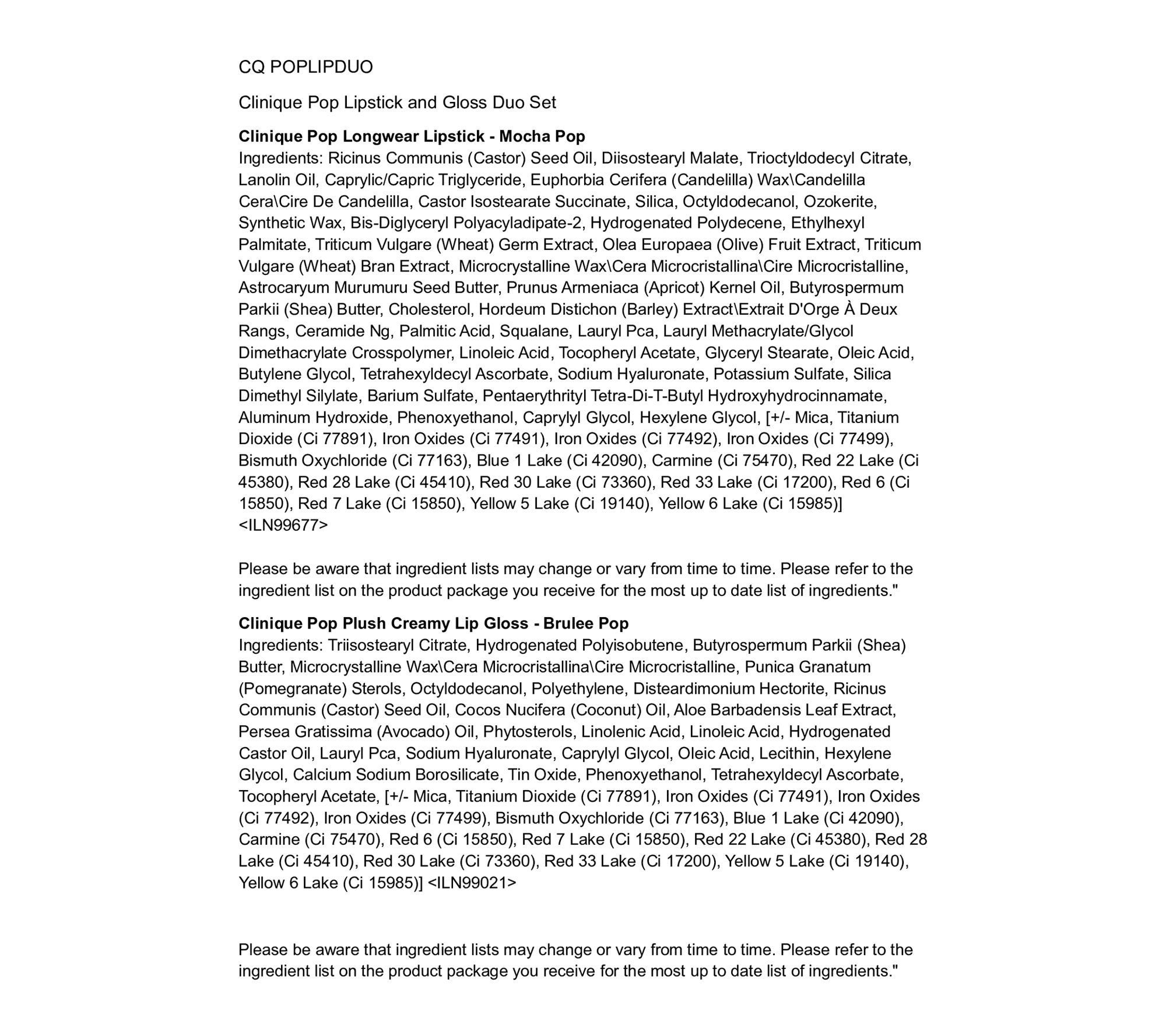 Now in a sleek green tube, Clinique Pop Longwear Lipstick merges rich, saturated color with a built-in primer for smooth application. This long-lasting lipstick glides on effortlessly and delivers ultra-pigmented, full-coverage color with each swipe. Suits all lips and looks, with a wide range of shades designed to match all skin tones and three finishes for every mood. Pop Plush Creamy Lip Gloss hugs lips with shine and hydration, all while delivering a pop of color. It glides on effortlessly to an shiny looking finish. The applicator features an hourglass-shaped doe foot that wraps around lips for super smooth and precise application, delivering the perfect slick of color.