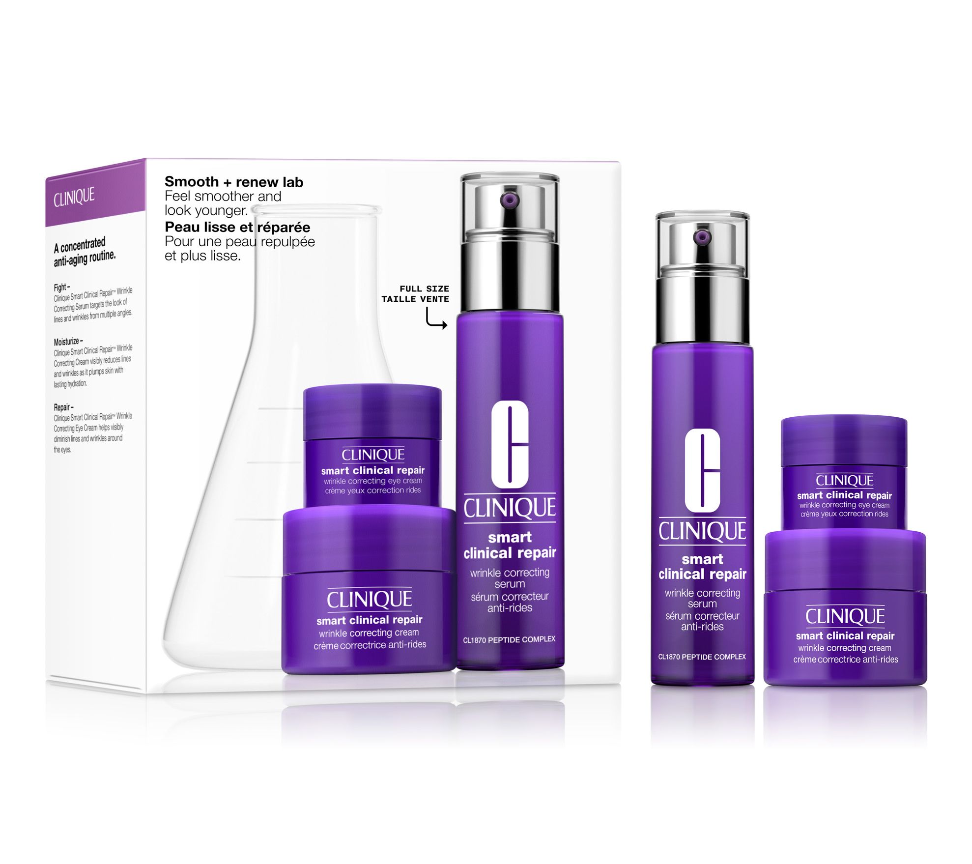 Look younger and smoother with these three de-aging favorites from the Clinique Skin School class series. Smart Clinical Repair Wrinkle Correcting Serum targets the look of lines and wrinkles from multiple angles. Peptide-rich formula helps visibly repair, resurface, and replump skin. Smart Clinical Repair Wrinkle Correcting Face Cream deeply hydrates to visibly reduce lines and wrinkles. Smart Clinical Repair Wrinkle Correcting Eye Cream helps visibly smooth the delicate area around the eyes.
