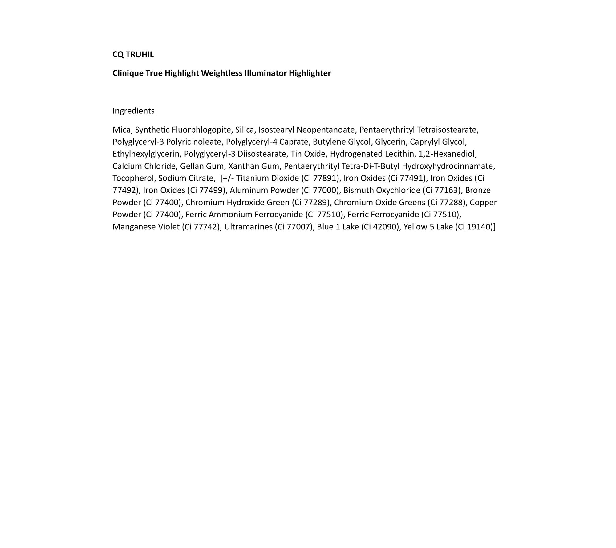Find your true light. Clinique True Highlight Weightless Illuminator Highlighter glides on weightlessly for a truly luminous effect. The dimensional highlighter is infused with light-reflecting pigments and pearls that play up skin's natural radiance, for a true glow from every angle. The weightless, emollient-infused formula glides on seamlessly and melts into skin. The mirrored compact is perfect for on-the-go illumination.