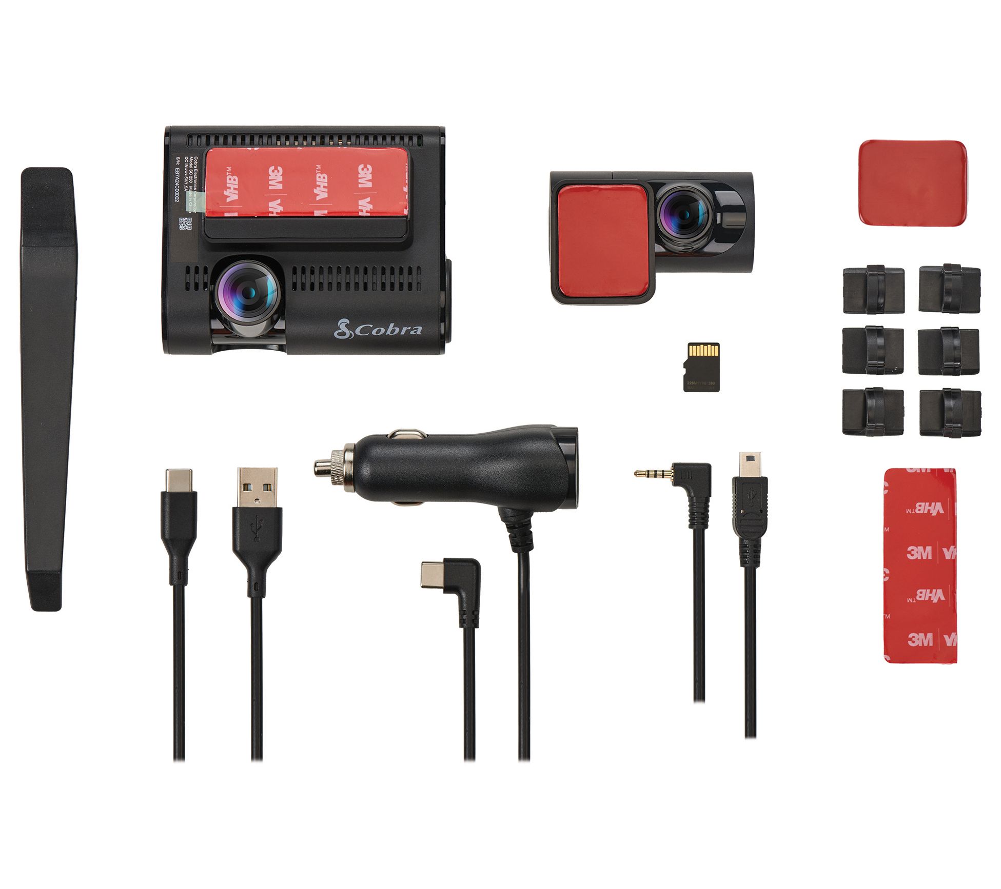 Includes Cobra SC 250R dash cam, rear camera, extension cable, 32GB SD card, cable management kit, temporary install film, and power cable