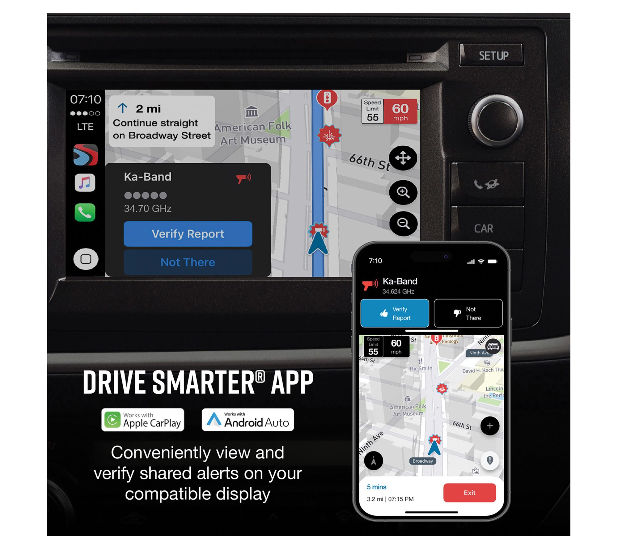 Upgrade your driving experience with the Cobra RAD 700i radar/laser detector. Its premium detection range and intelligent filtering software help provide more accurate alerts and a quieter ride. With built-in Bluetooth, connect to the Drive Smarter community for shared alerts, enhancing road safety and awareness. AutoLearn Intelligence uses GPS to silence false alerts over time, making your trips smoother and more enjoyable. From Cobra.