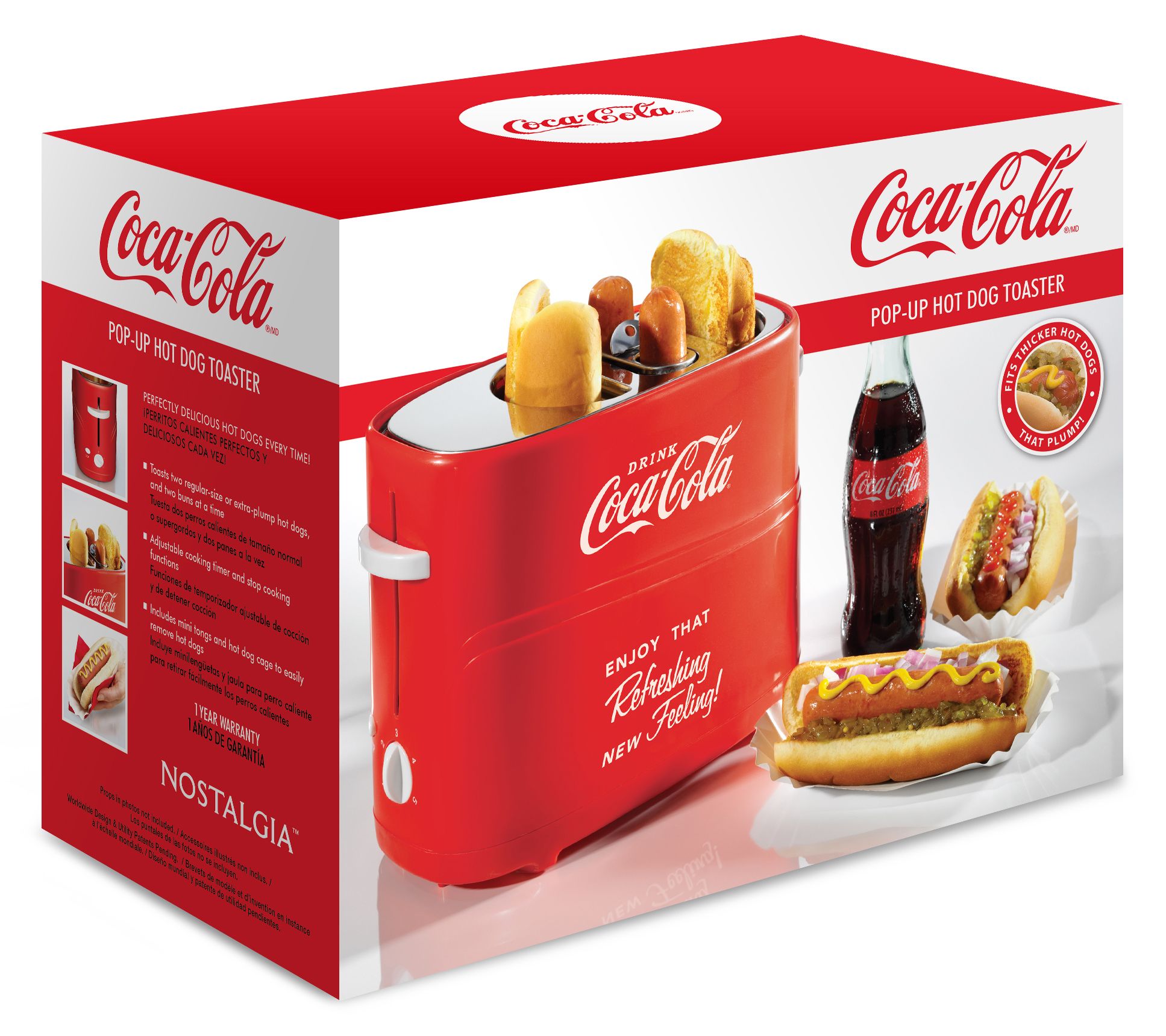 Make mealtime a breeze with this Coca-Cola pop-up hot dog toaster. Prepare delicious hot dogs and buns simultaneously, right at your kitchen counter. Adjust the heat setting to your liking and use the included mini tongs for easy hot dog removal. Perfect for quick meals or when entertaining guests, this toaster adds fun and functionality to any kitchen. From Coca-Cola.