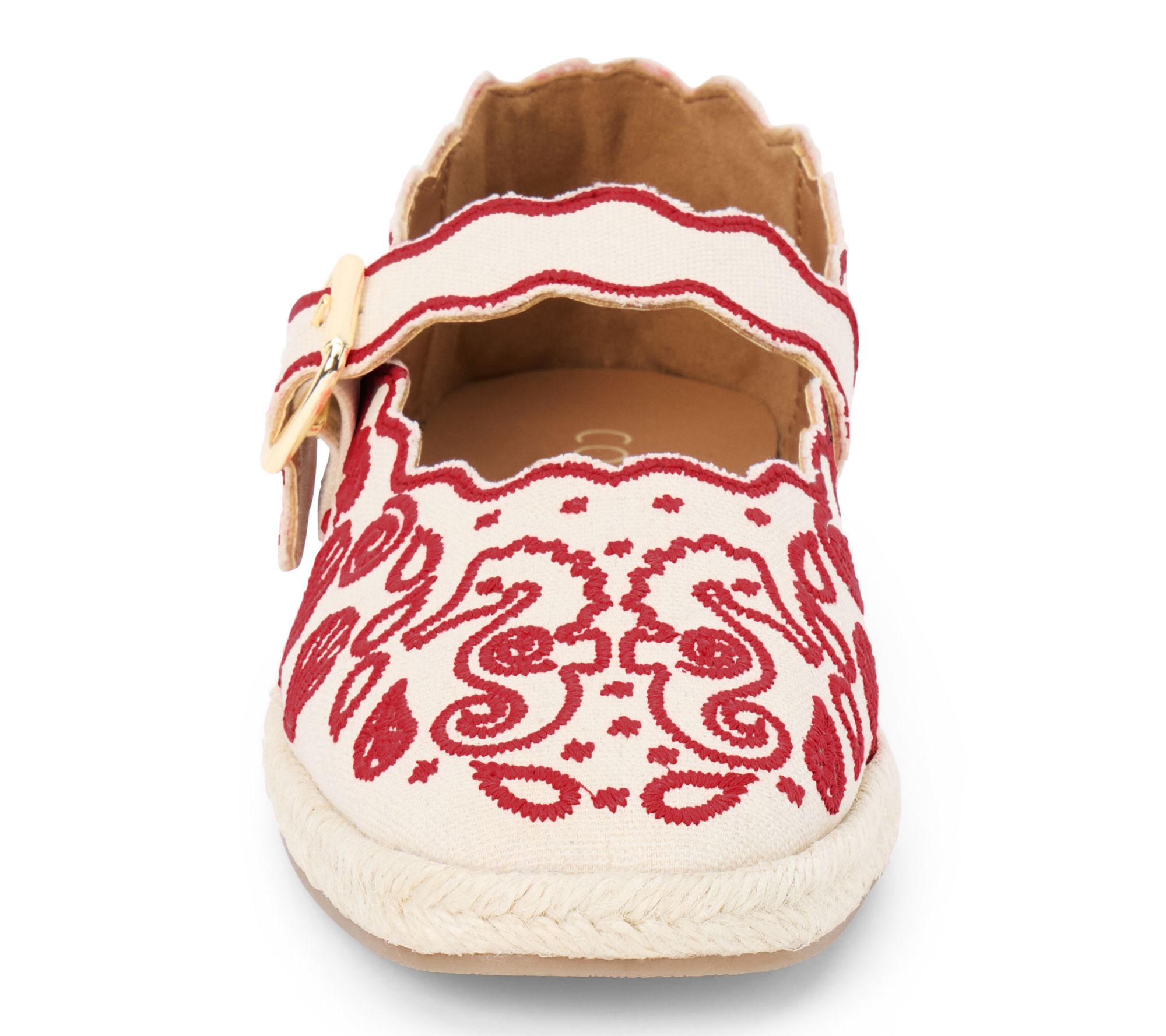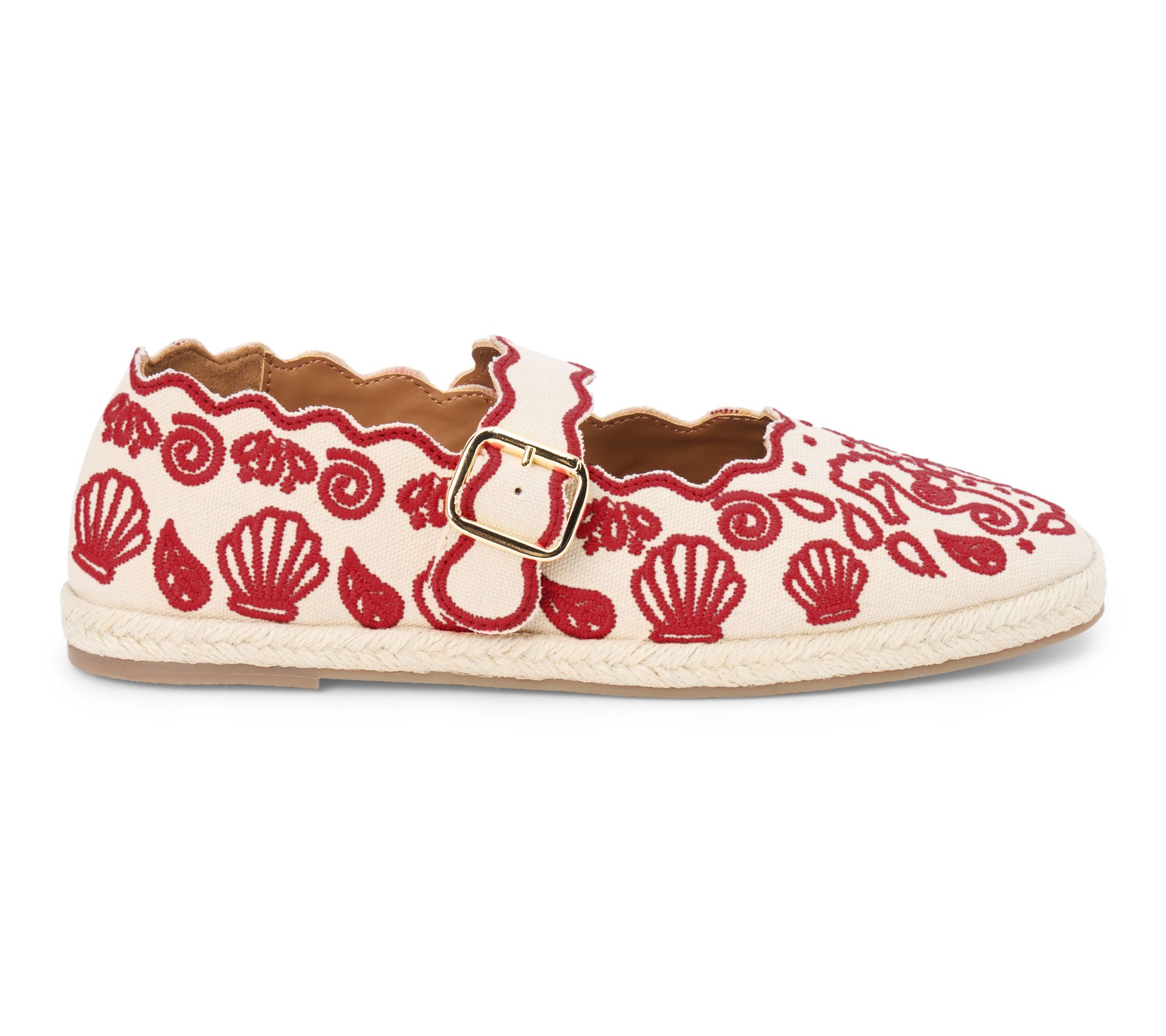 • Mary Jane silhouette, fabric upper, strap closure with buckle, scalloped edges, embroidery