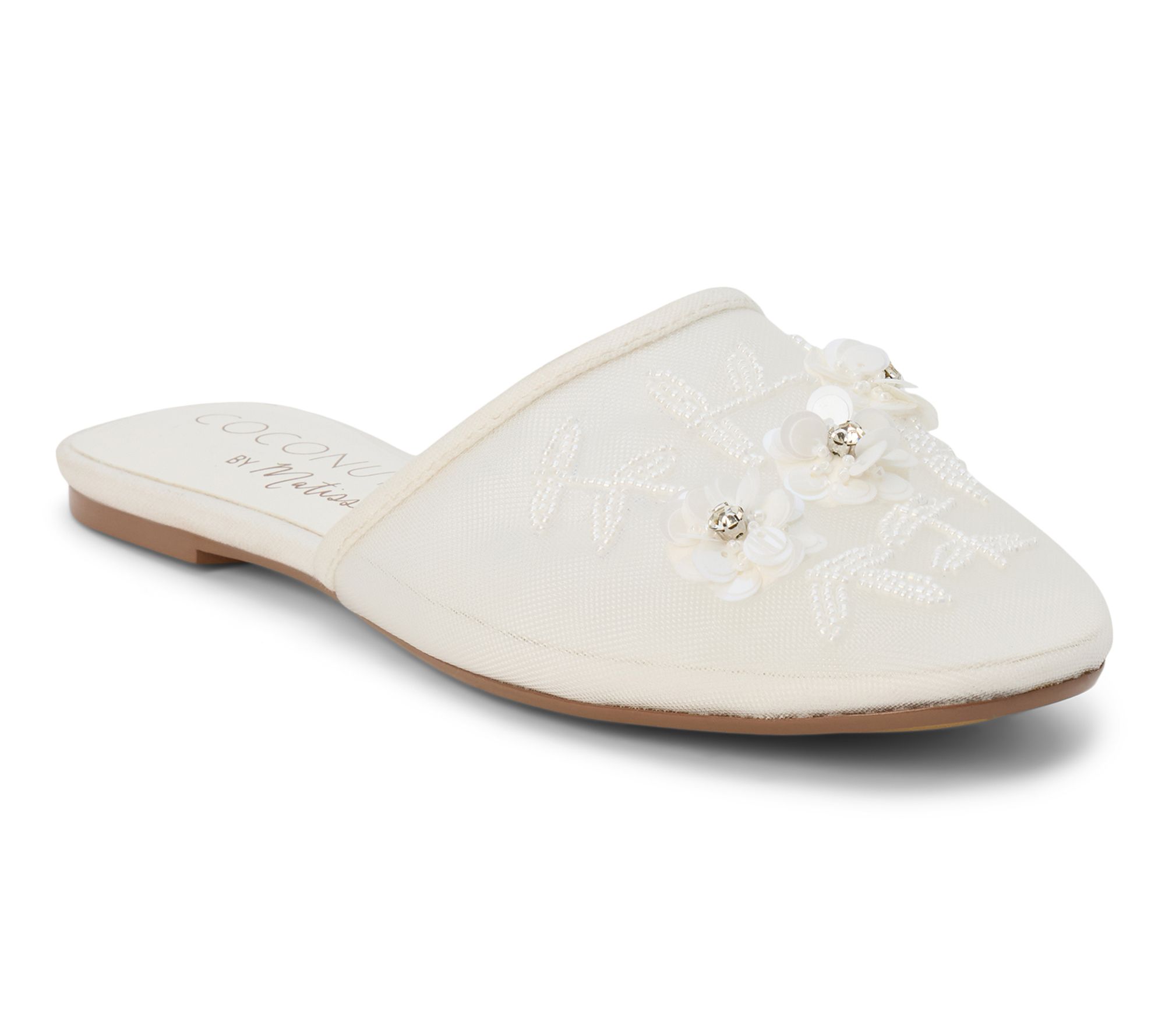Mesh upper with open-back mule design, floral applique, rounded toe