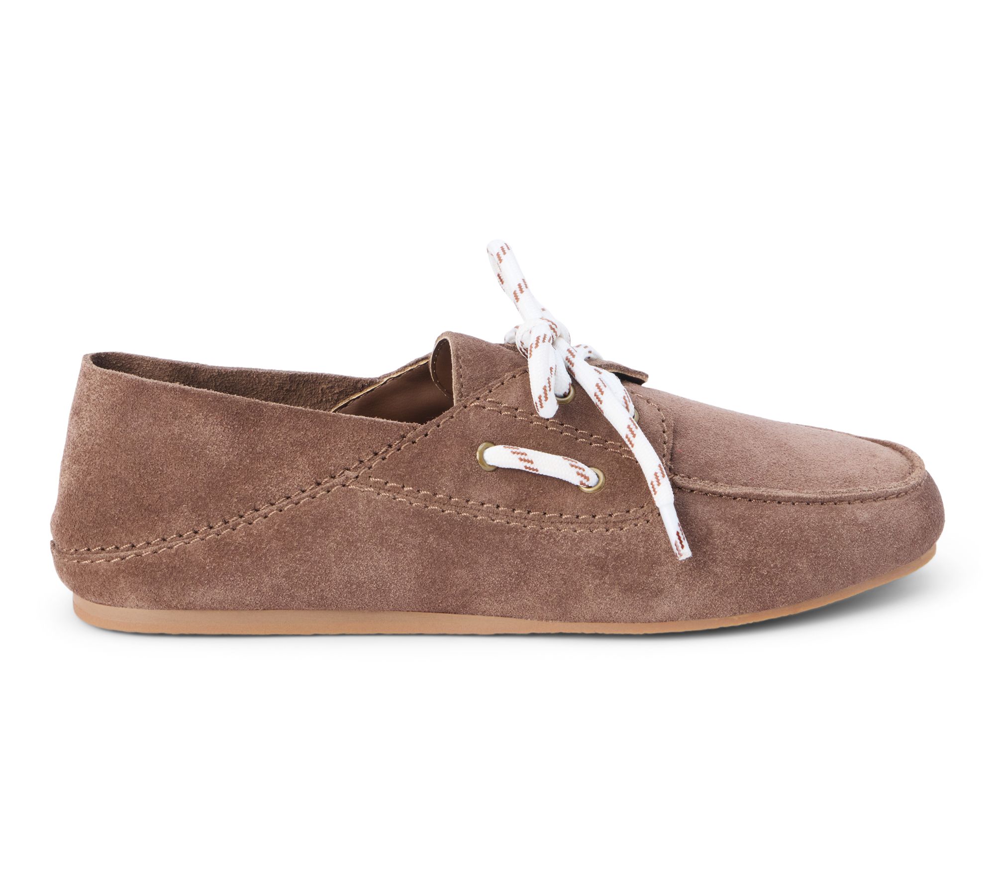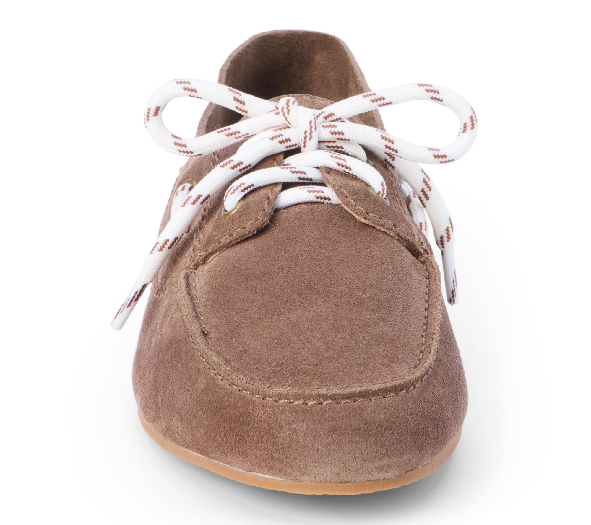 Suede upper with boat shoe design; lace-up closure; moc toe