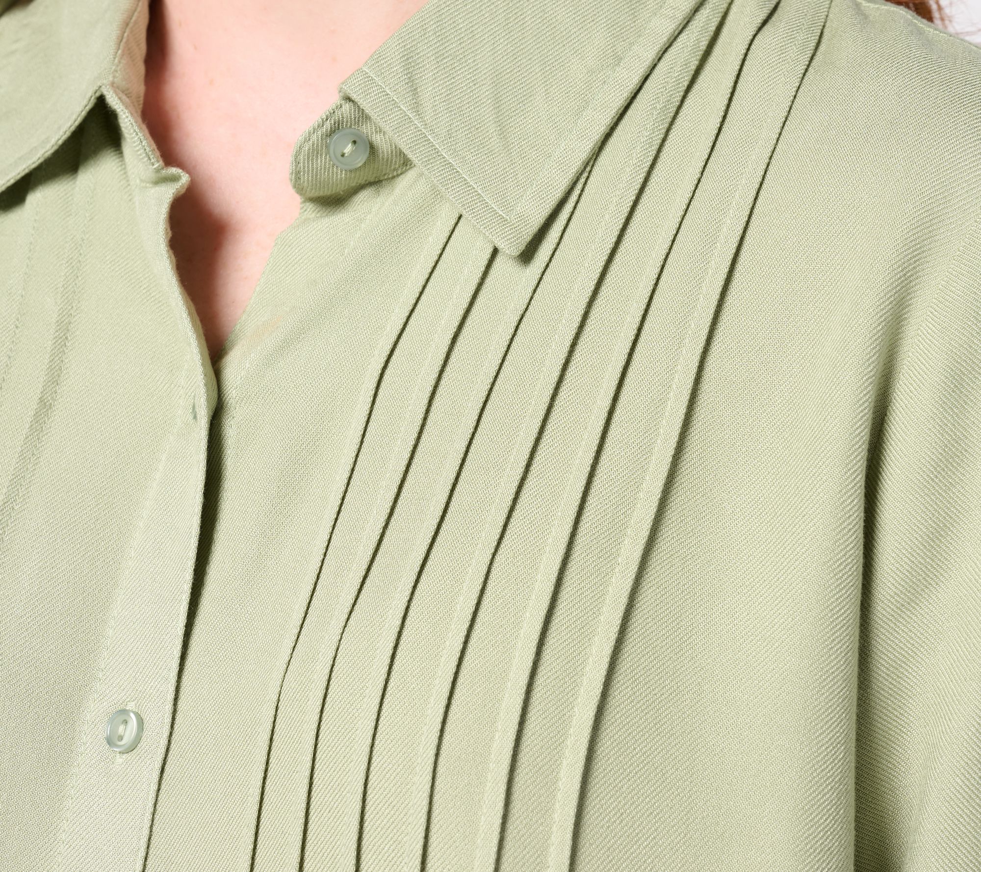 Features: long sleeves, button-front closure, collar neckline, button cuffs, front pintuck details