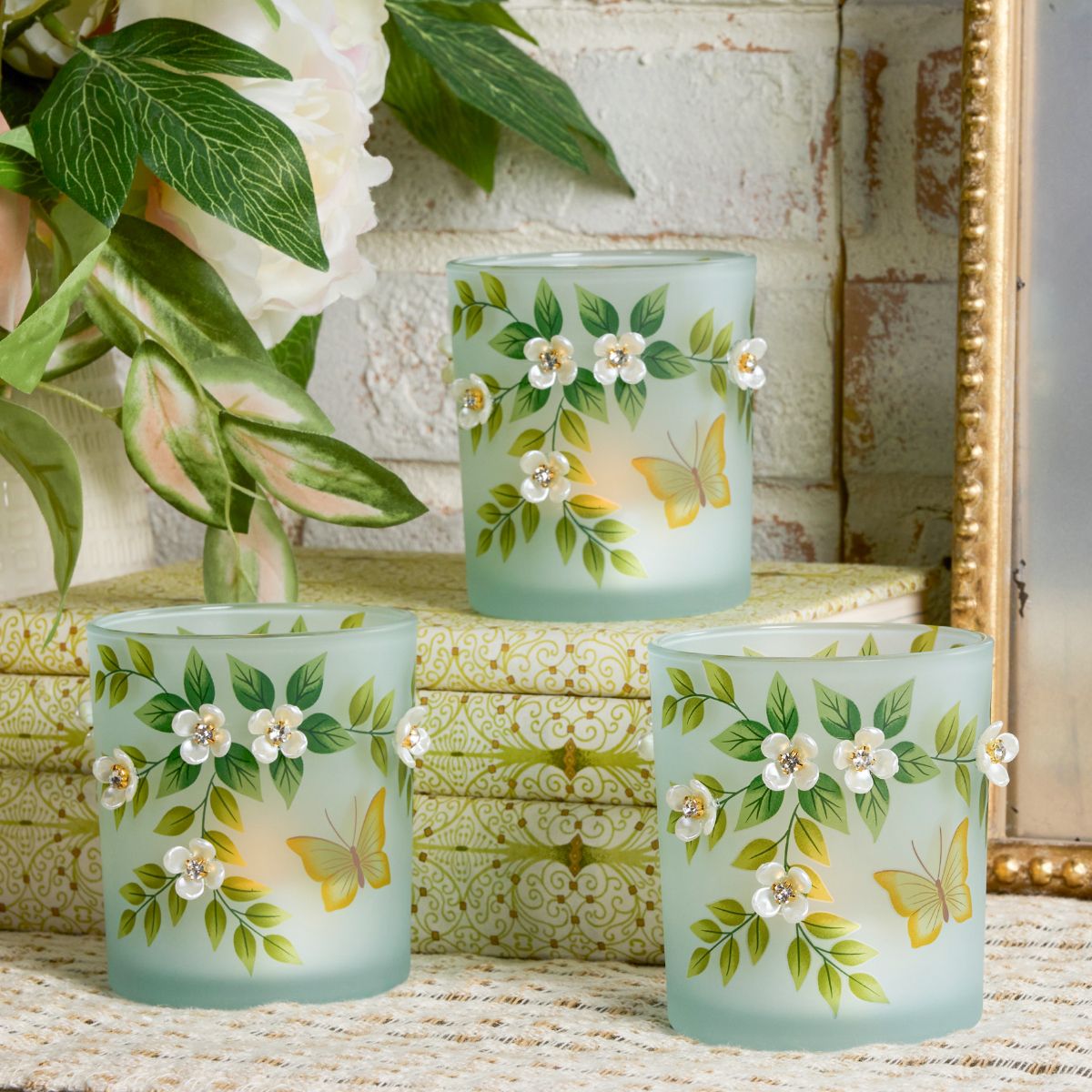 Set of 3 Illuminated Mini Hurricanes w/Pearl Flowers by Valerie