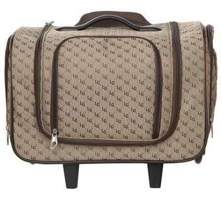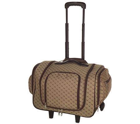 Bag exterior: jacquard logo weave shell; PVC trim; rigid bottom frame; corner-mounted wheels; button-lock, telescoping handle; three zip pockets with dividers; U-shaped opening