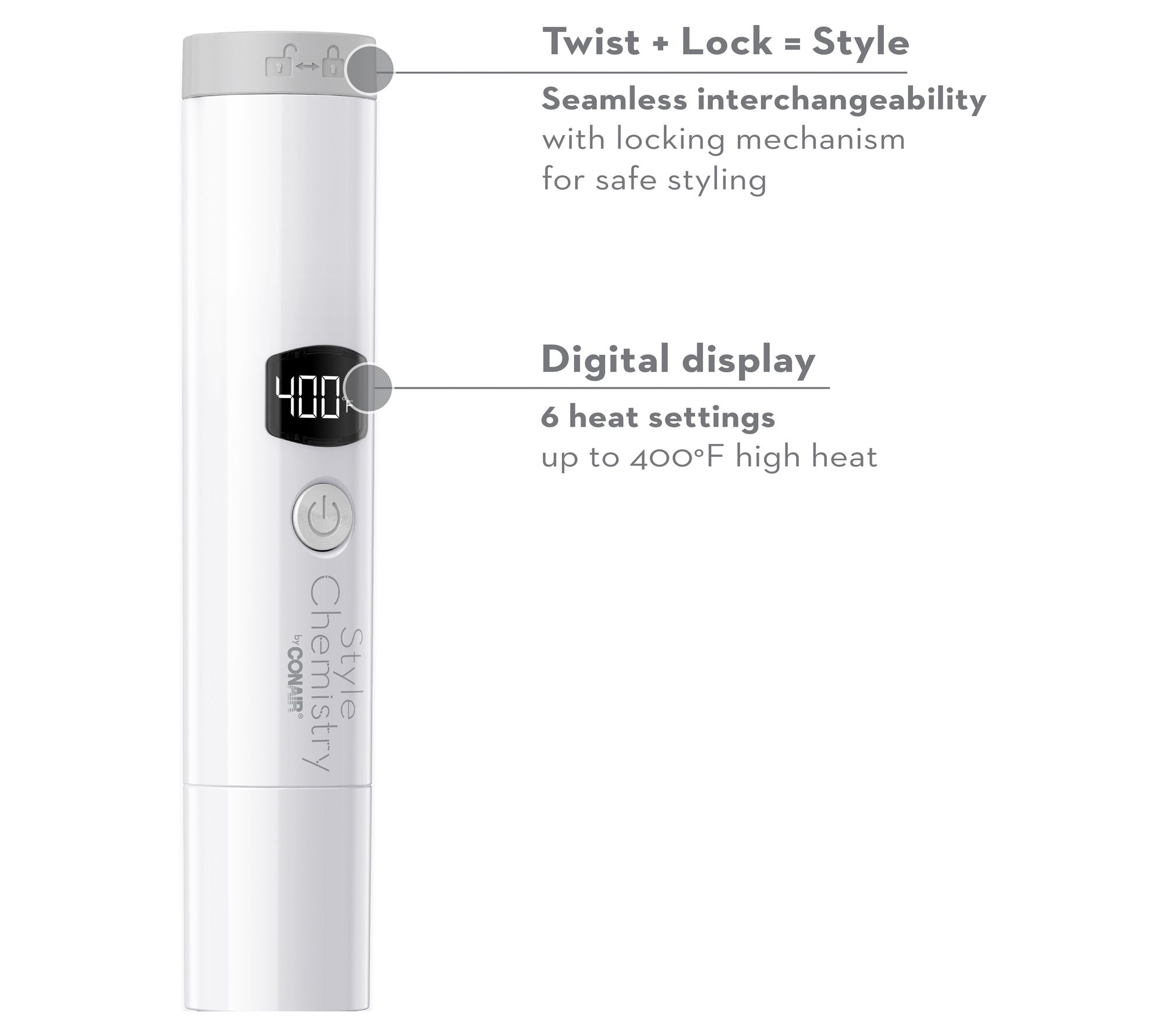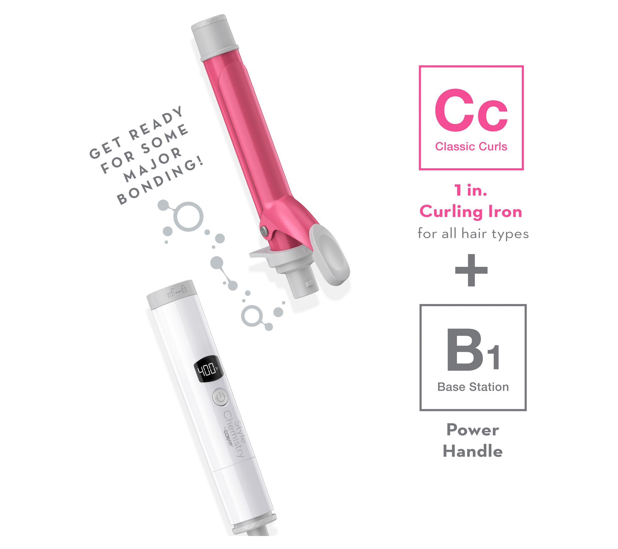 Introducing the Style Chemistry by Conair starter pack -- the style system you can personalize with custom attachments! Begin with this Base Station Power Handle and 1" ceramic-coated curling iron attachment to create classic curls.