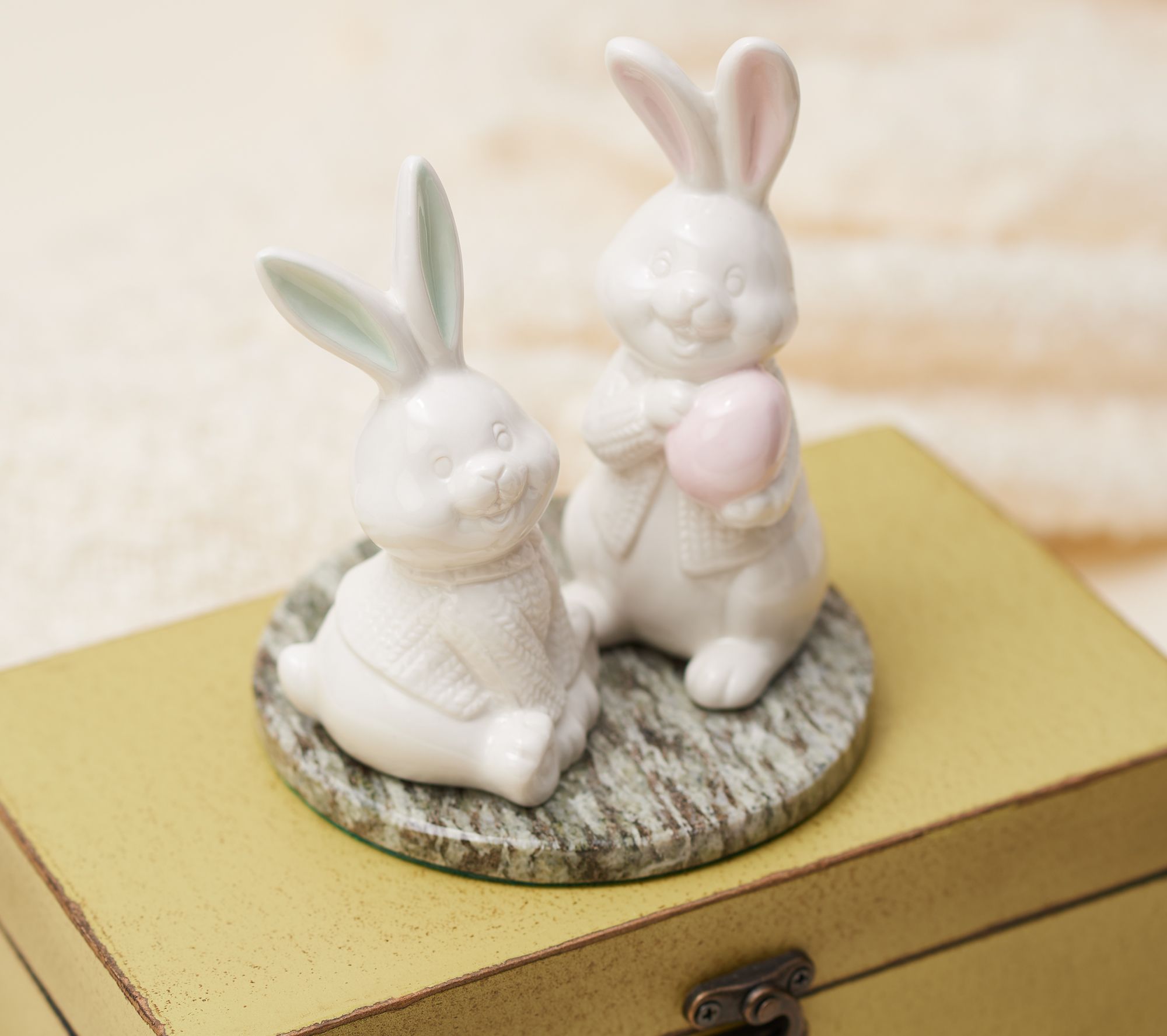A delightful duo, these cheerful ceramic bunnies sit atop a marble base to bring Irish charm and welcoming whimsy to your Easter decor.