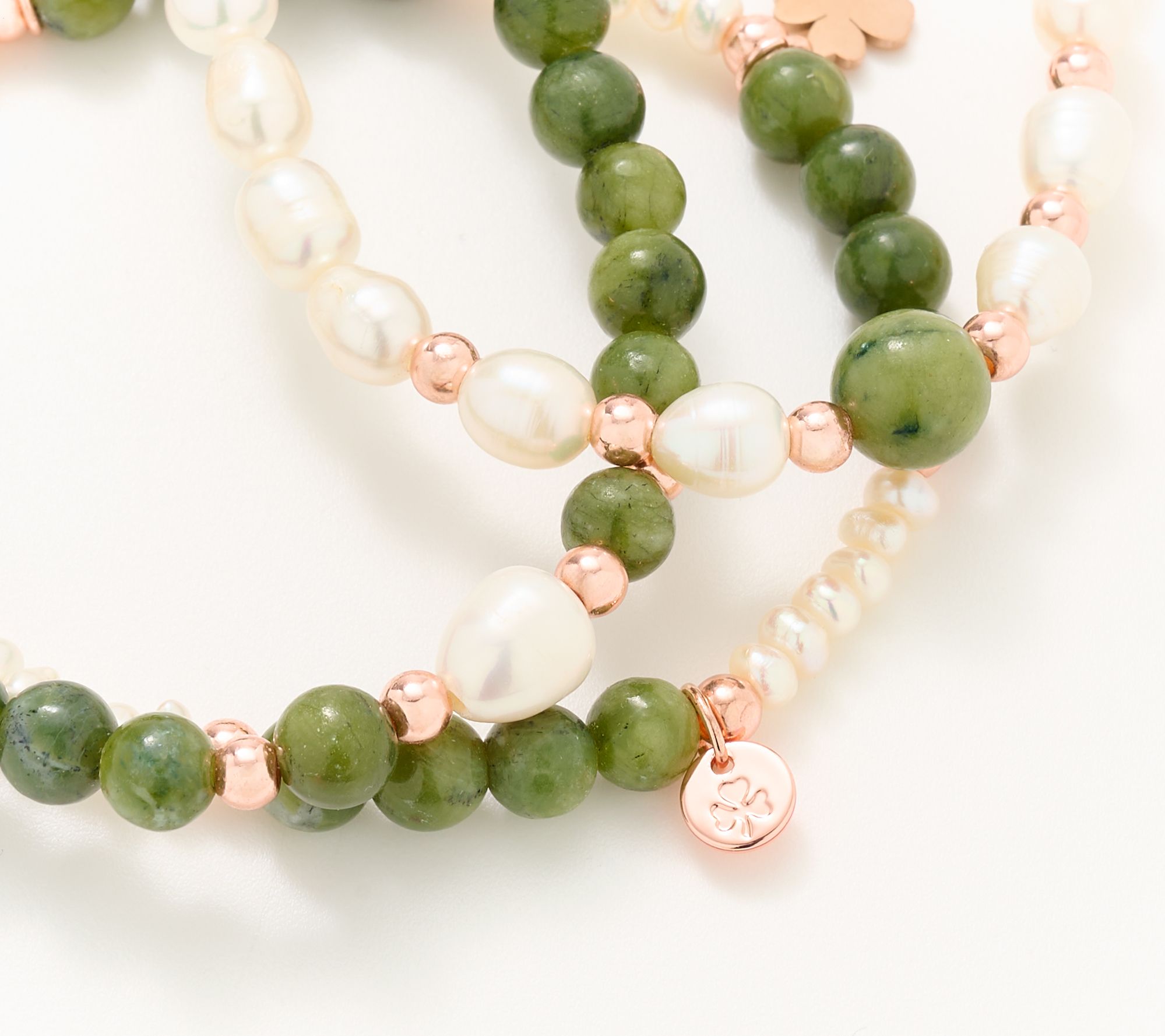 Whether you're keeping it real with close friends or dressing up for a special gathering, this set of three stretch bracelets offers eye-catching style with its distinctive Irish motifs and rich mix of marble and cultured freshwater pearl beads. Stainless steel rose goldtone accents and thoughtful charm details make every stack unique. From Connemara Marble.