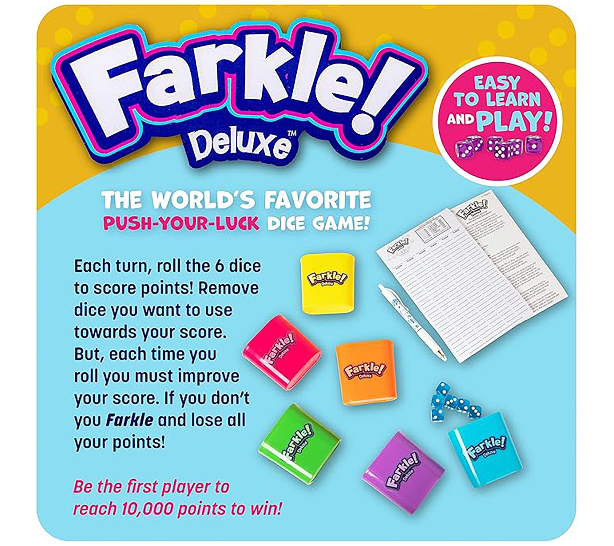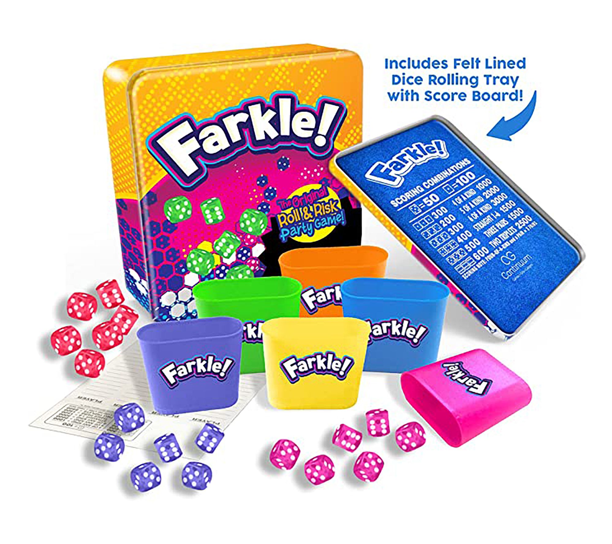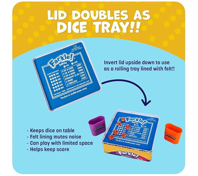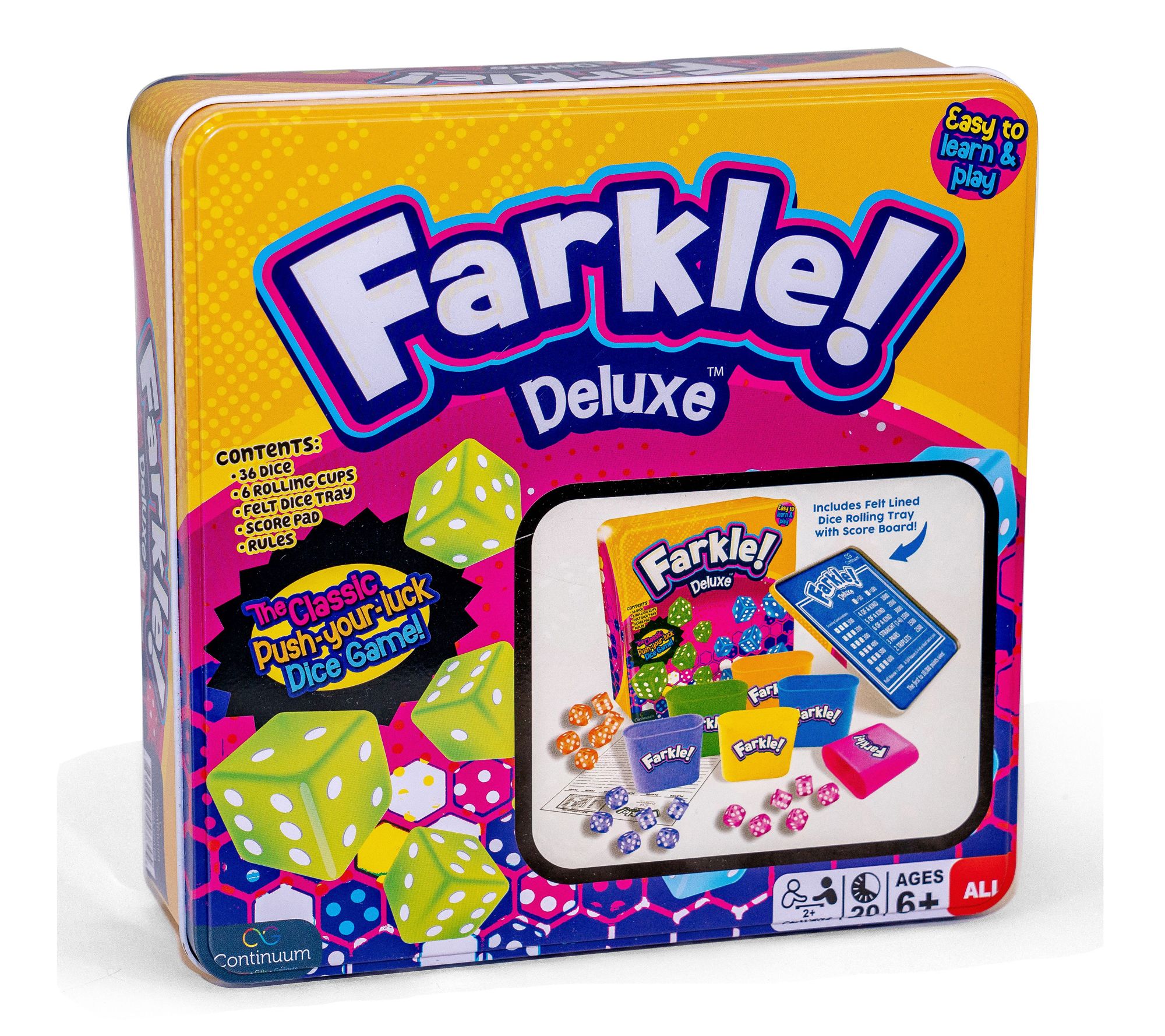 Bring excitement to your game nights with Continuum Games Deluxe Farkle! With up to six players getting their own dice and cup, it's a fast-paced, high-scoring game that's perfect for any gathering. The durable travel tin and cleverly designed rolling tray make it easy to take the fun anywhere. From Continuum Games.