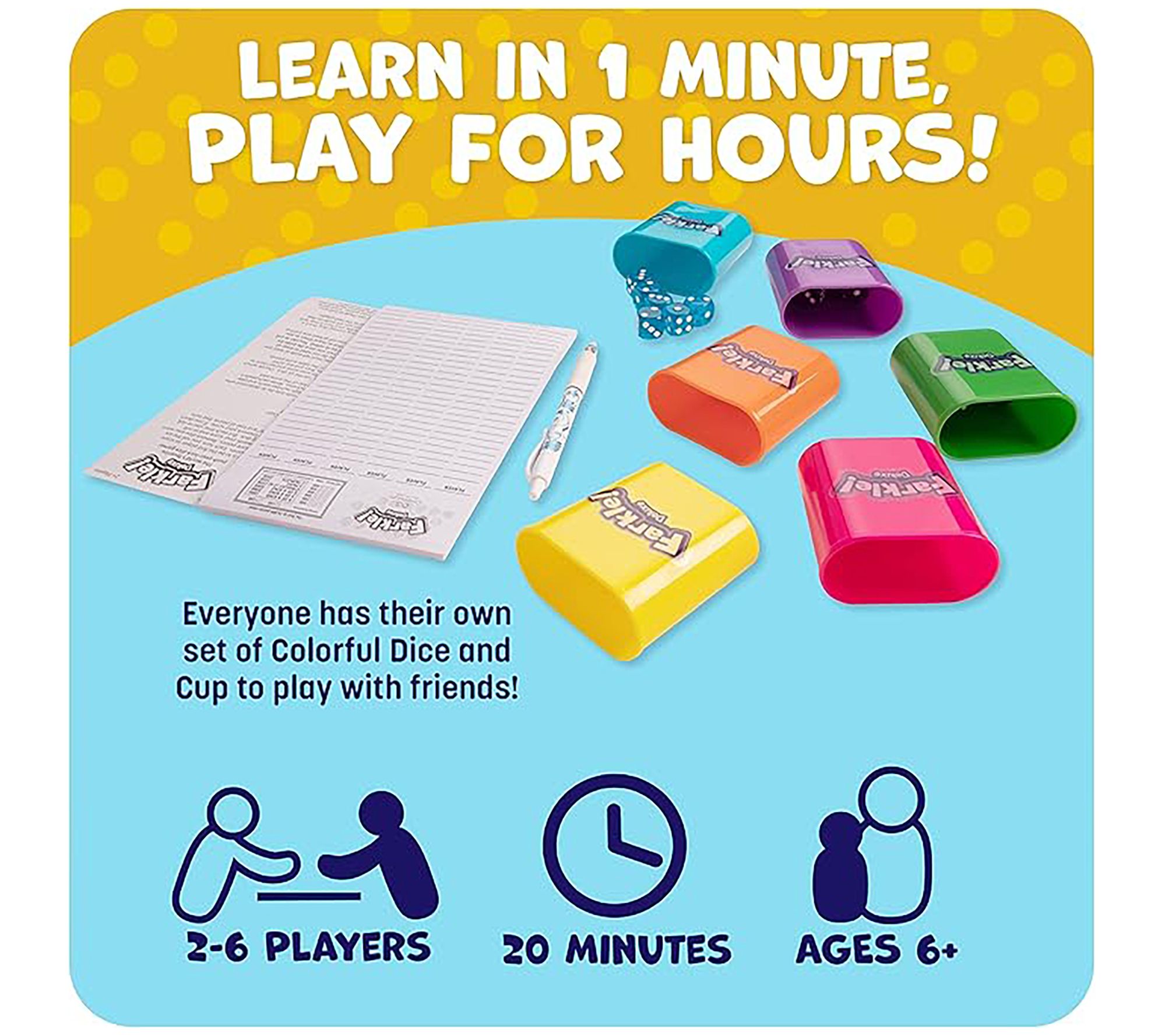 • Includes easy storage tin with rolling dice tray, six sets of six colorful dice, six dice cups, score pads, dice tray, and rules