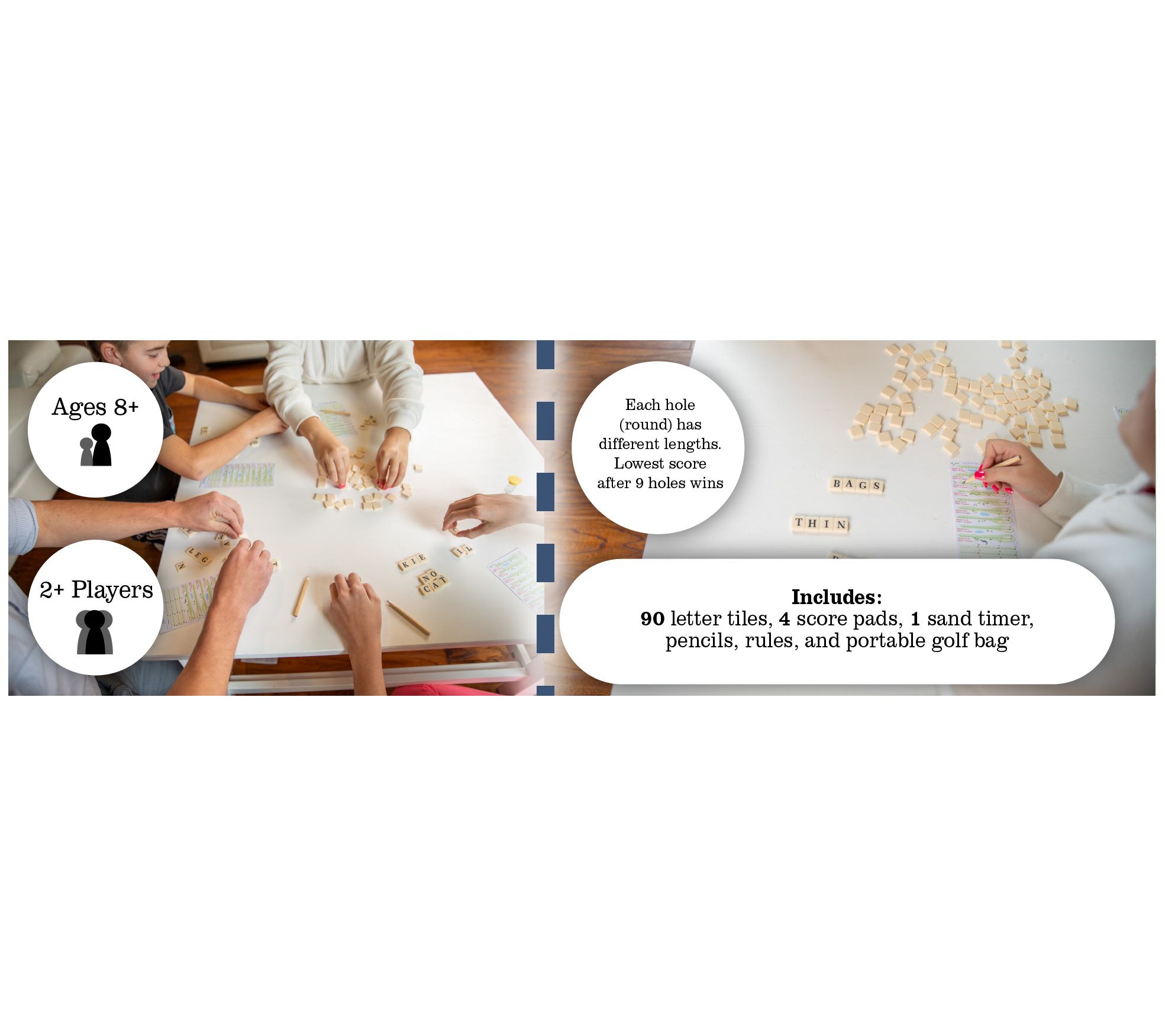 • Includes 90 letter tiles, four score pads, 2-minute sand timer, pencils, rules, and portable golf bag