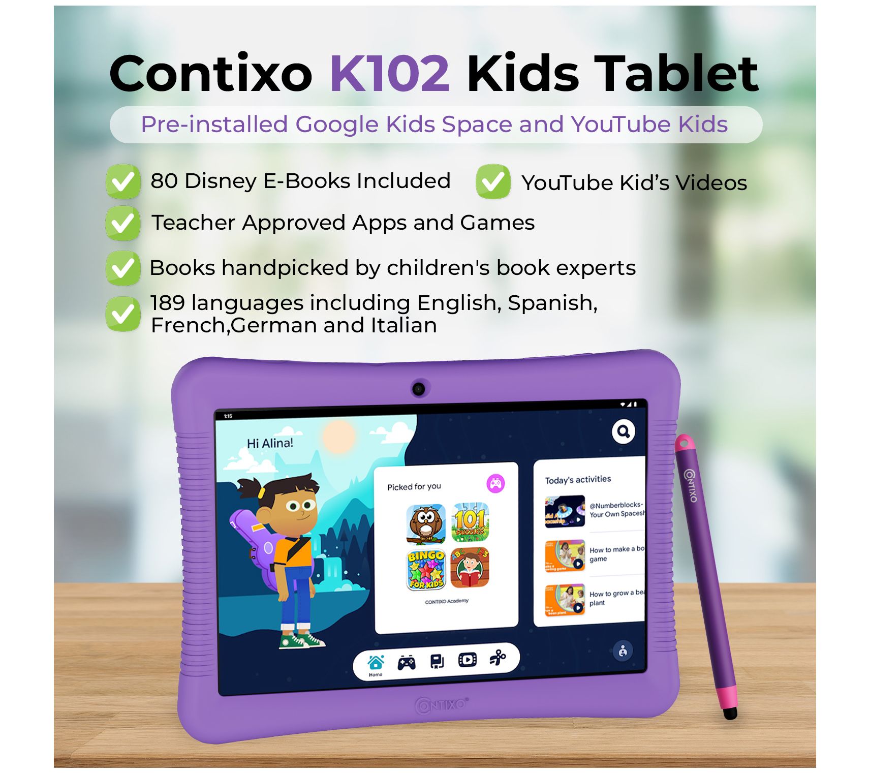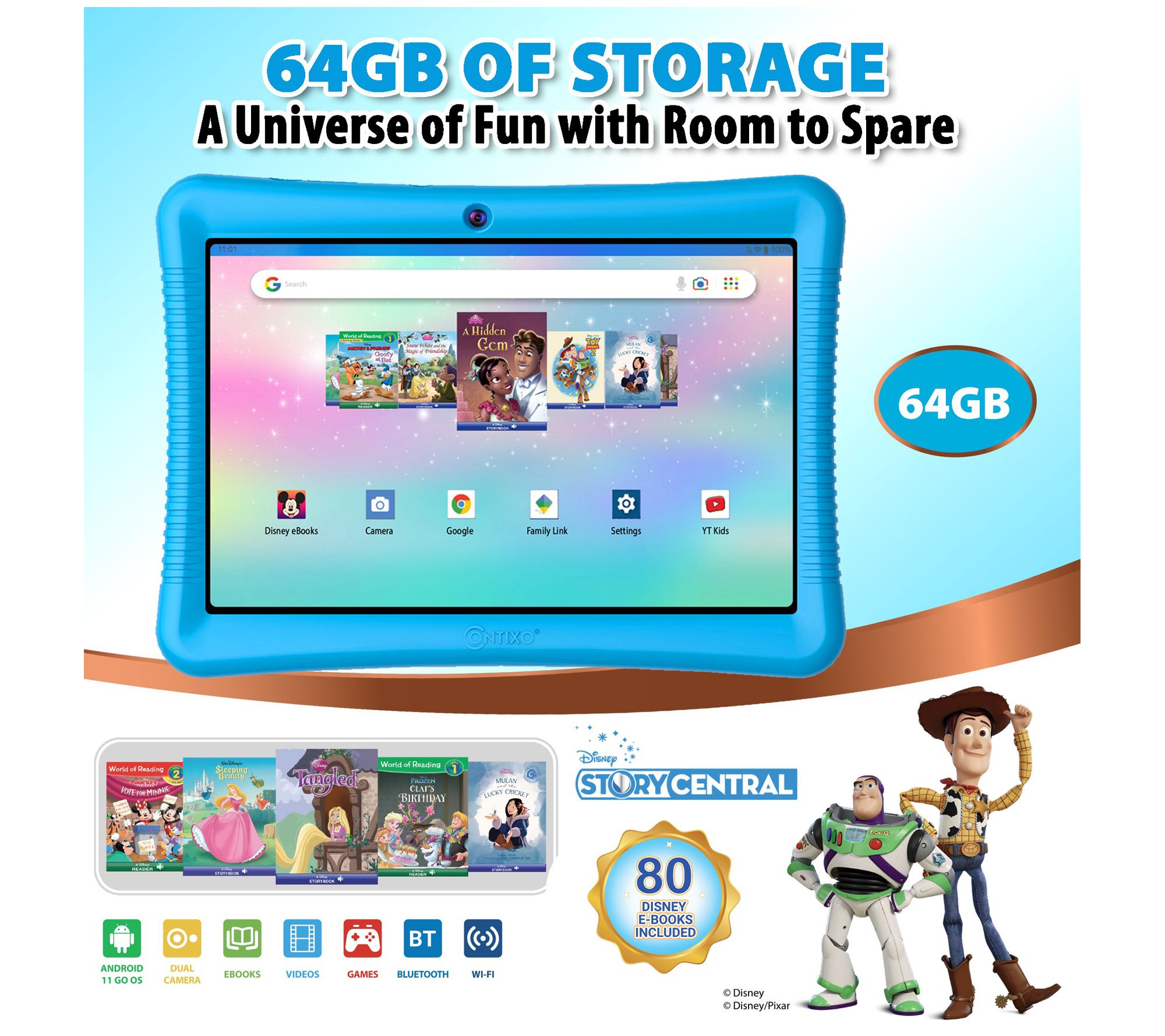 Gift your child the gift of tailor-made learning, creativity, and entertainment with the Contixo K102 tablet. This kid-friendly tablet is preloaded with 50 Disney eBooks enabled with digital audio to help engage budding readers, along with a gateway to a plethora of educational apps. Parental controls allow you to manage screen time and content. From Contixo.
