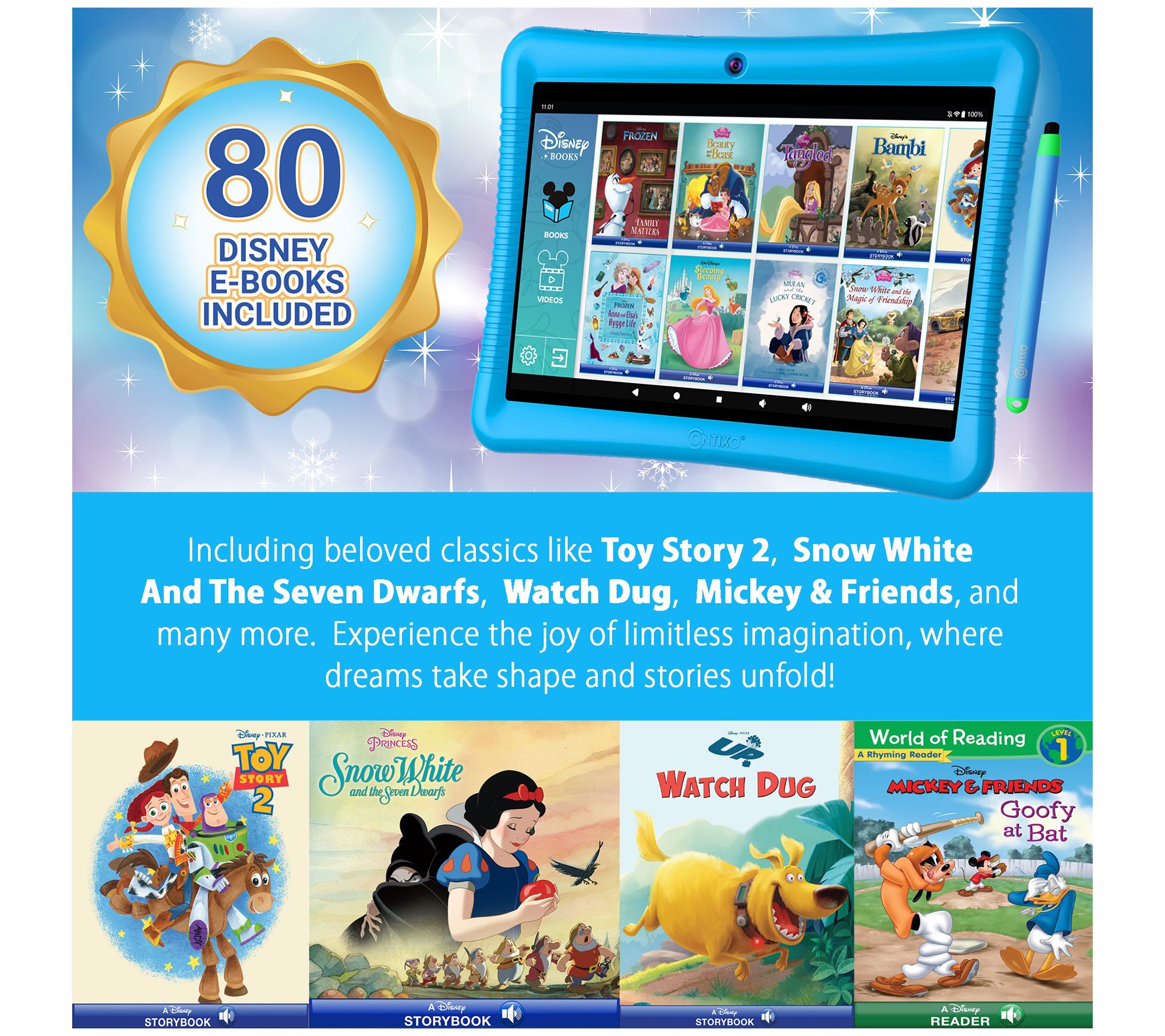 • 50 pre-installed Disney digital audio eBooks and 30 video eBooks