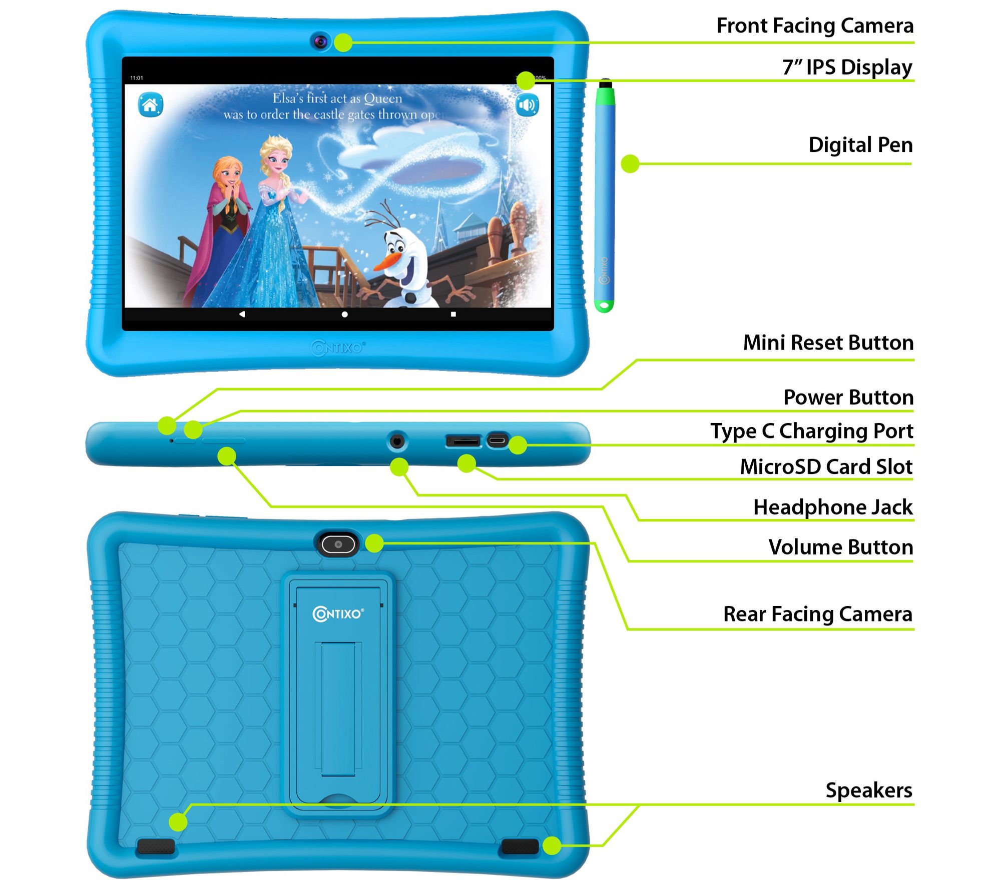 • Includes K102 tablet with screen protector, silicone kickstand case, USB Type-C charging cable, power adapter, 16 Disney cartoon stickers, and manual