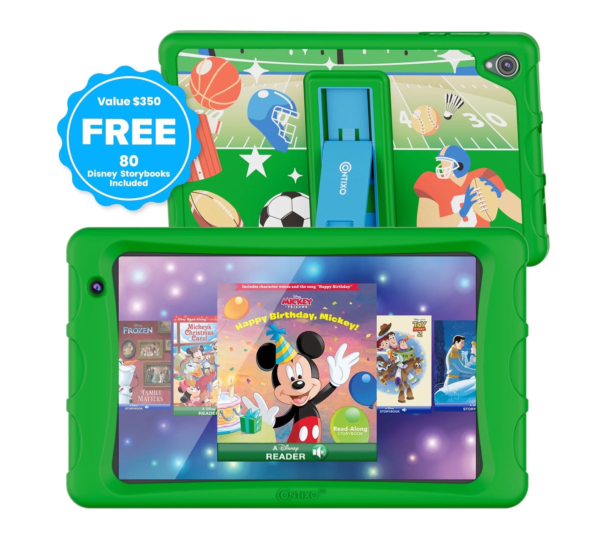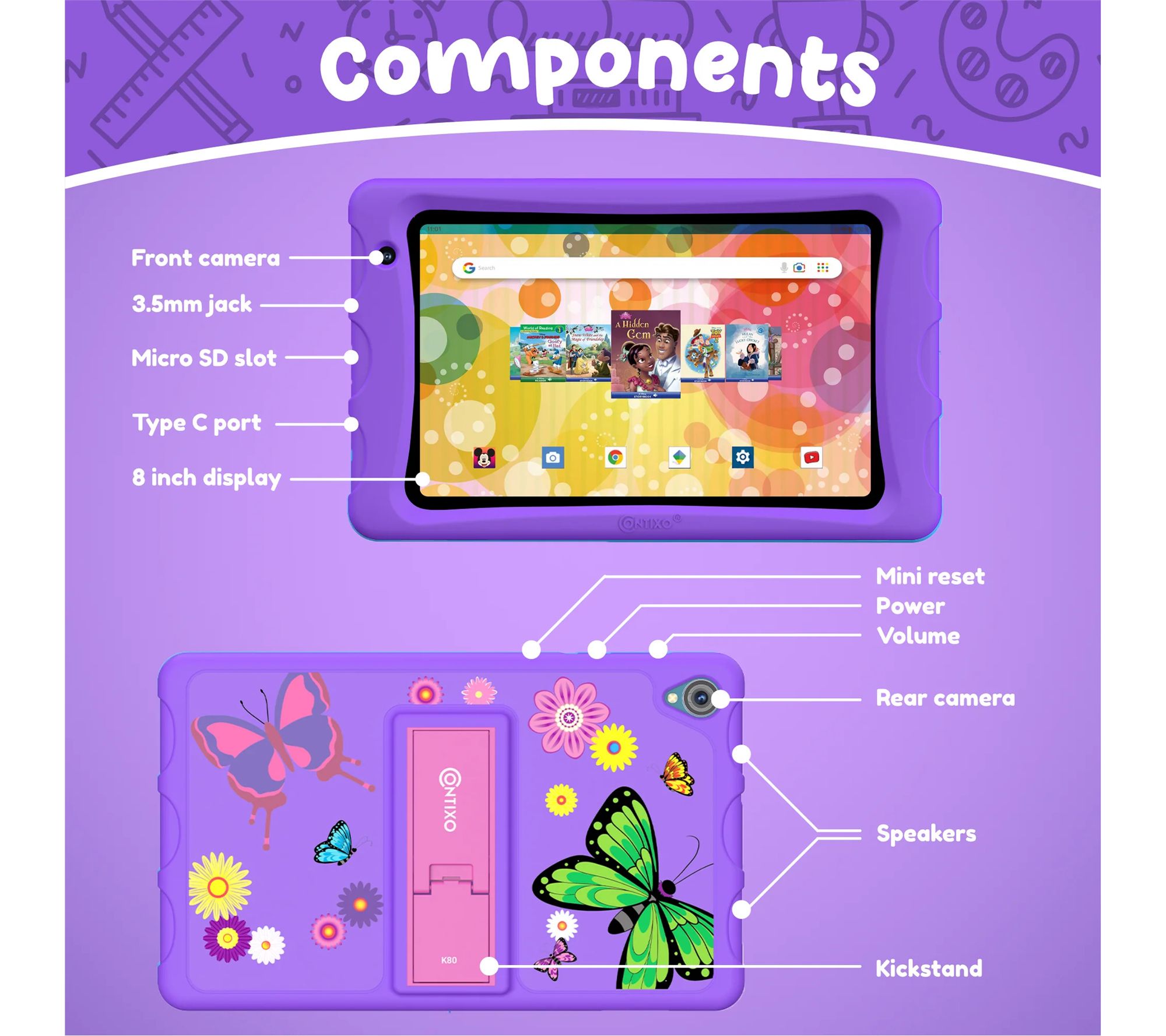 Includes K80A tablet with bumper and stand, headphones, and tablet bag