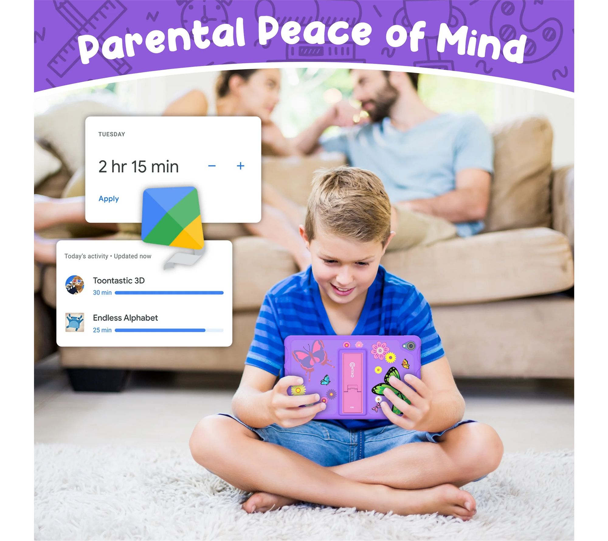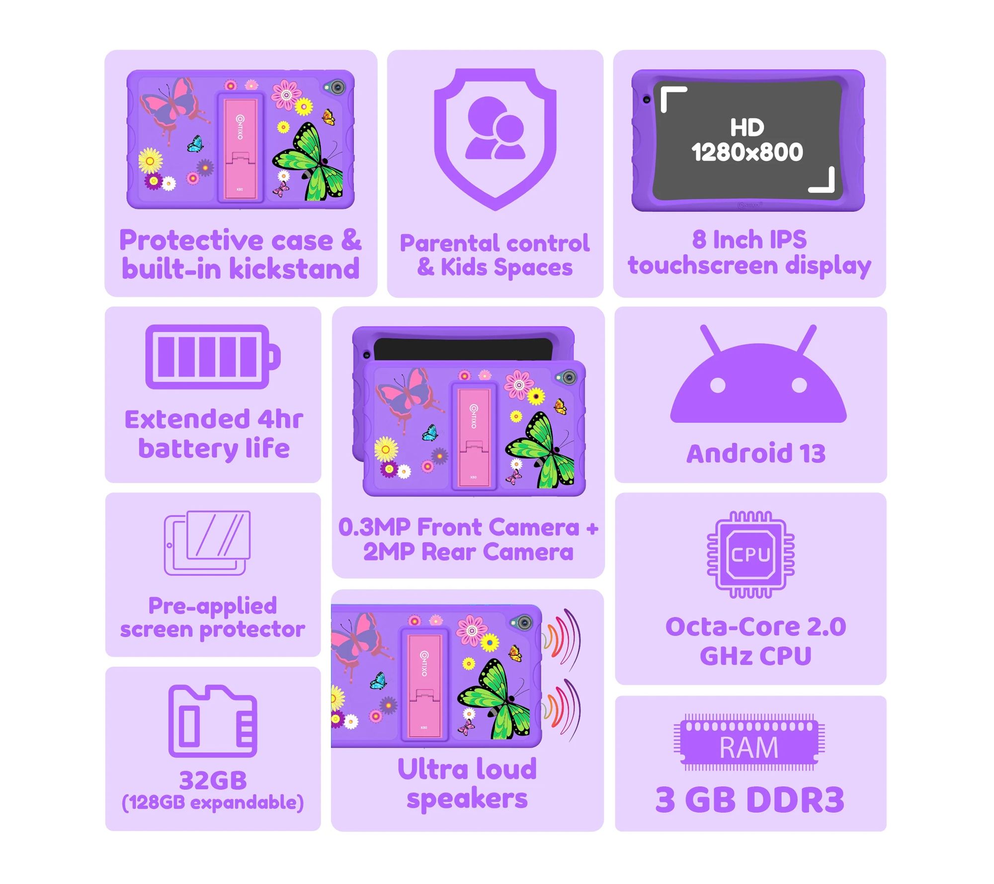 Make screen time fun and educational with this kids tablet, perfect for learning, games, and streaming favorite shows at home or on the go. With an 8" display, 32GB of storage, headphones, and a carrying bag, your child can explore a world of entertainment and creativity just about anywhere. From Contixo.
