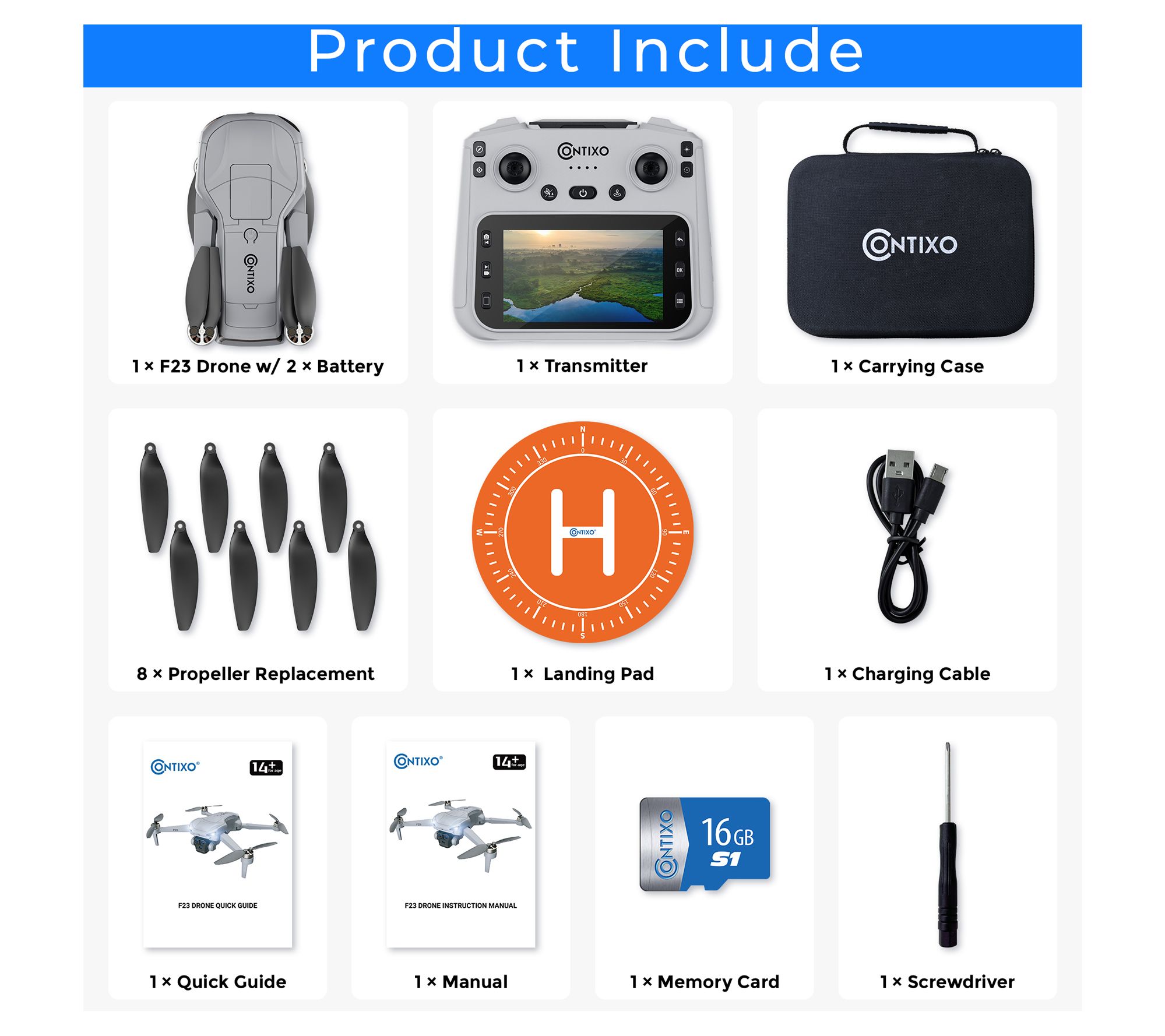 • Includes drone, transmitter, carrying case, propeller replacement, landing pad, charging cable, manual, memory card, and screwdriver