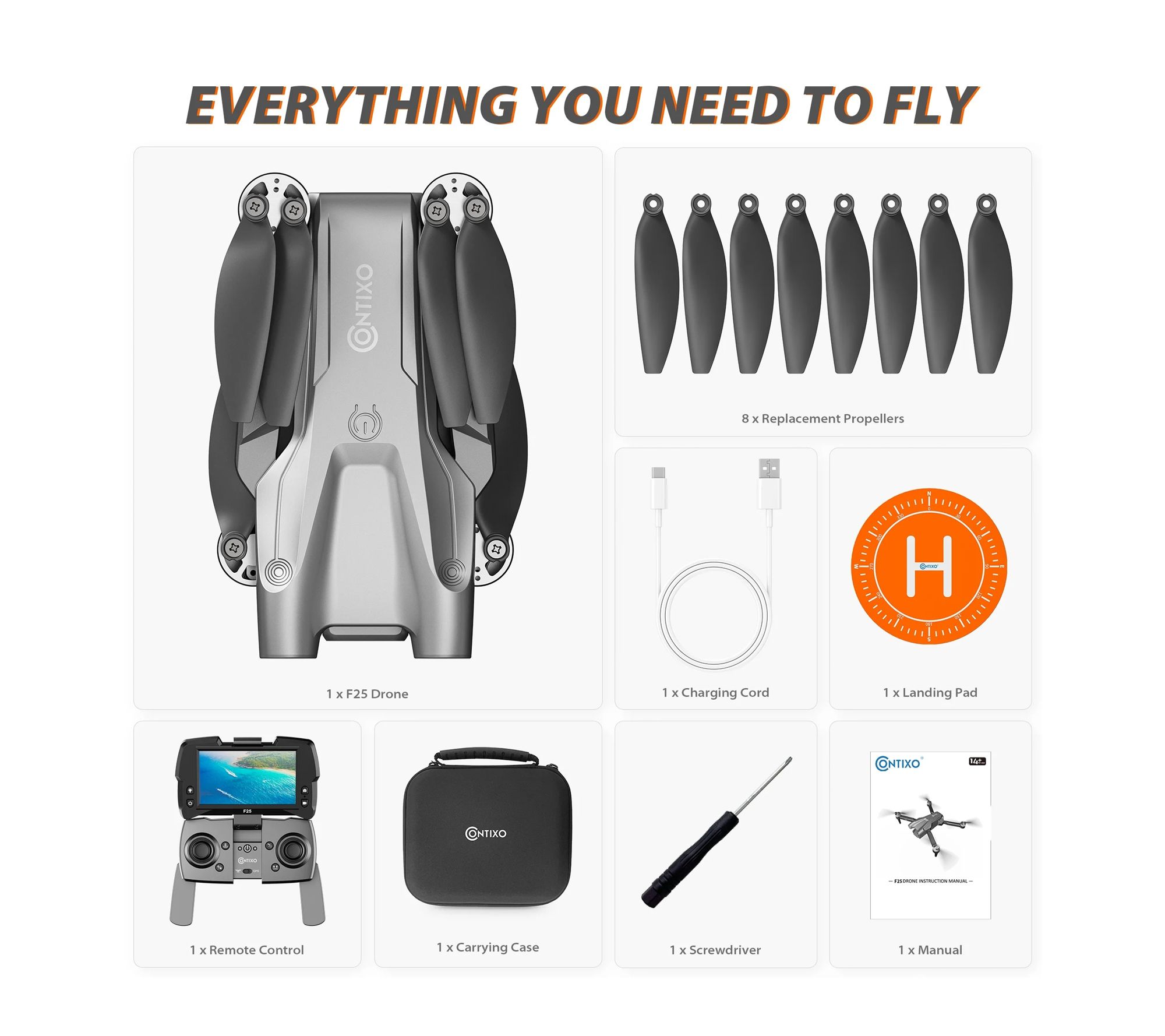 • Includes drone, remote control, carrying case, landing pad, propeller replacements, charging cord, screwdriver, manual