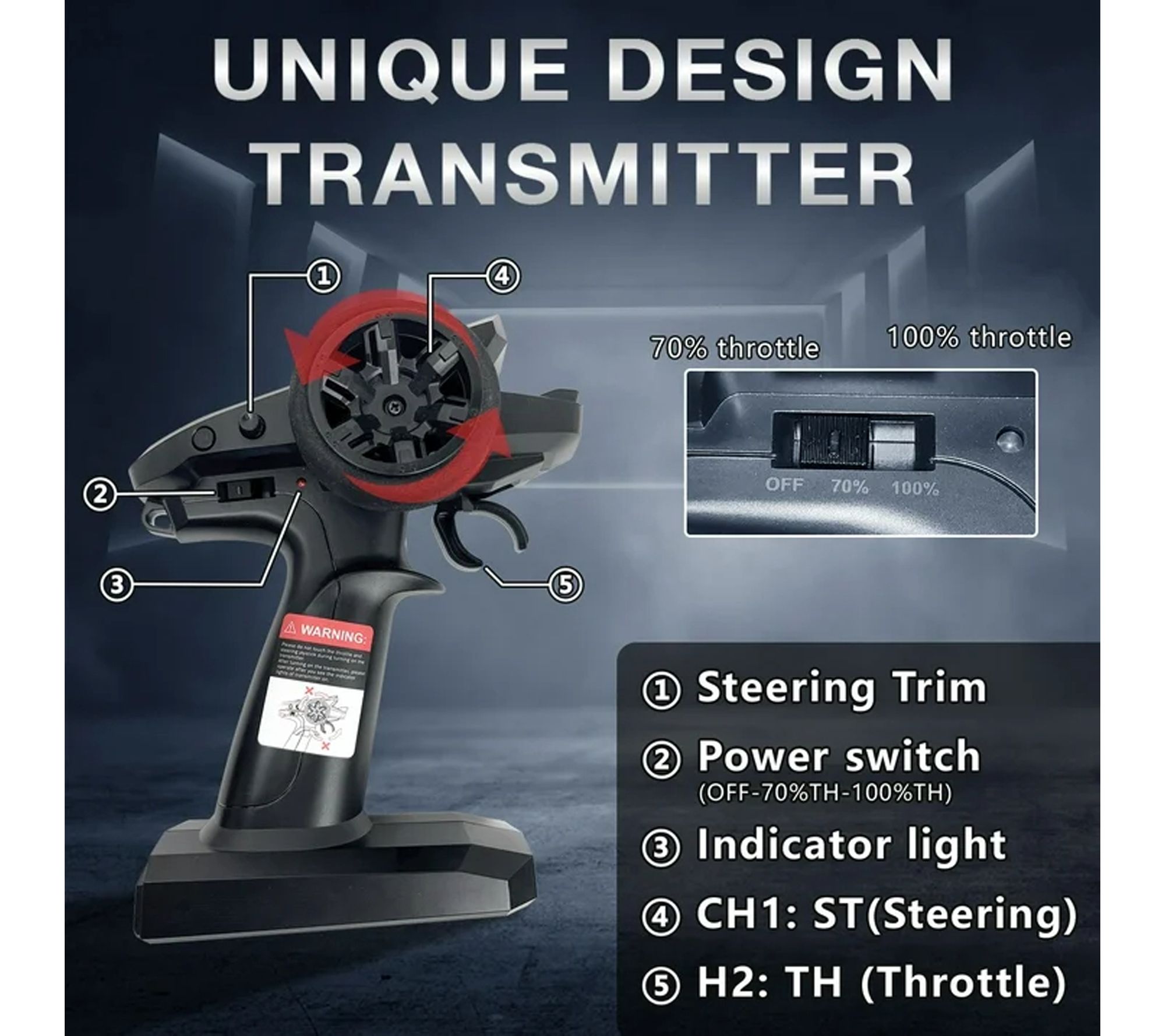 2.4 GHz remote control with 150-foot range; requires 2 AA batteries, not included