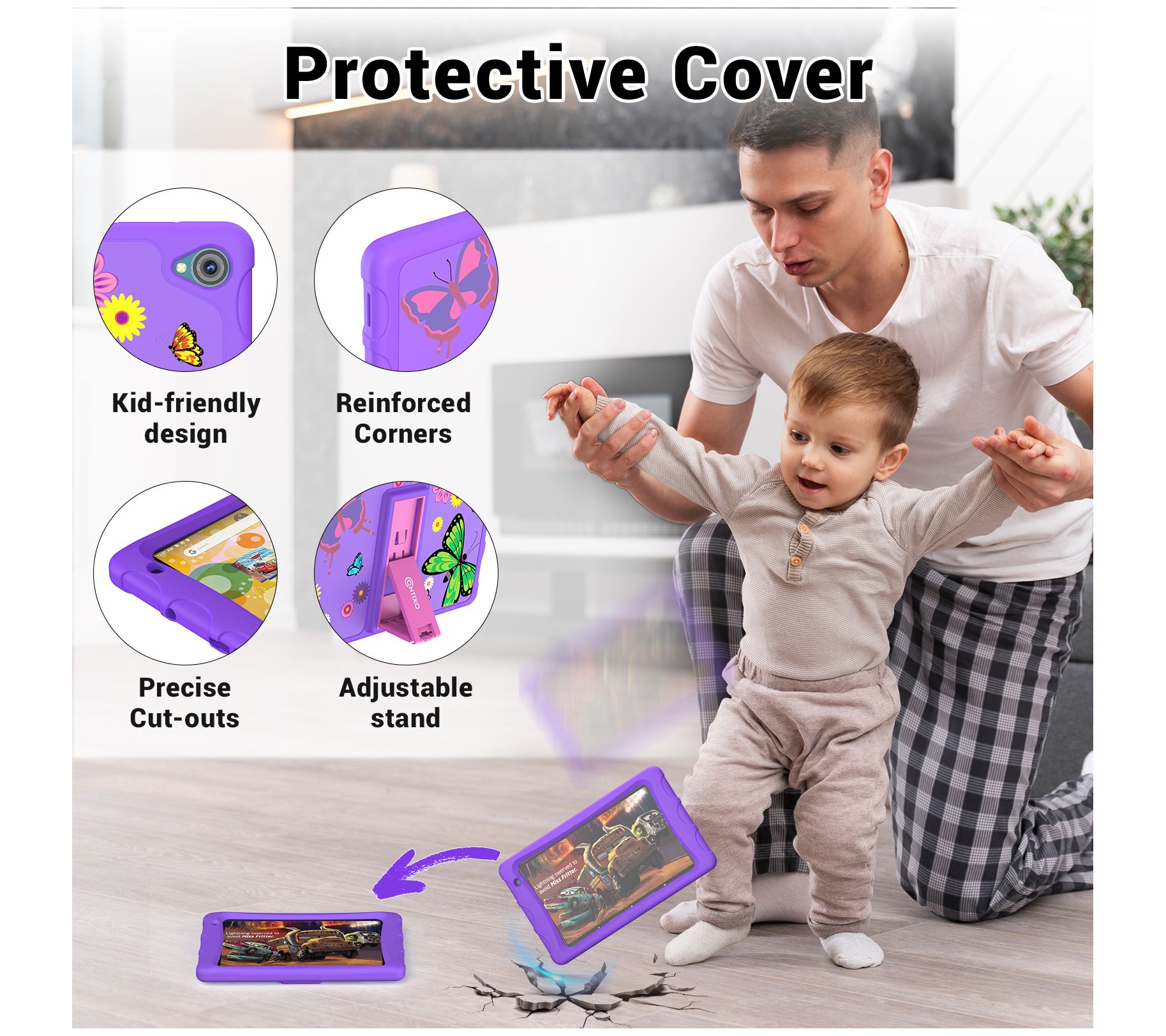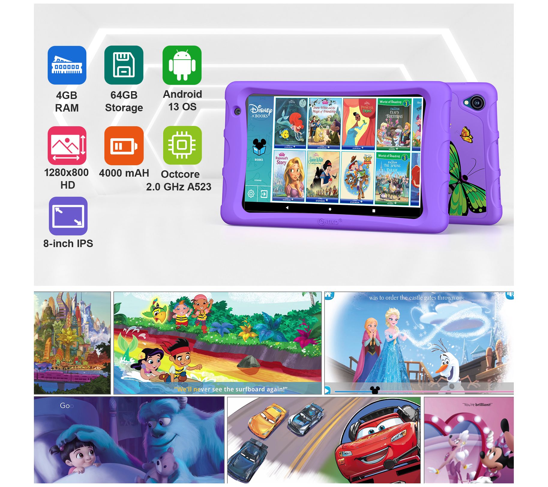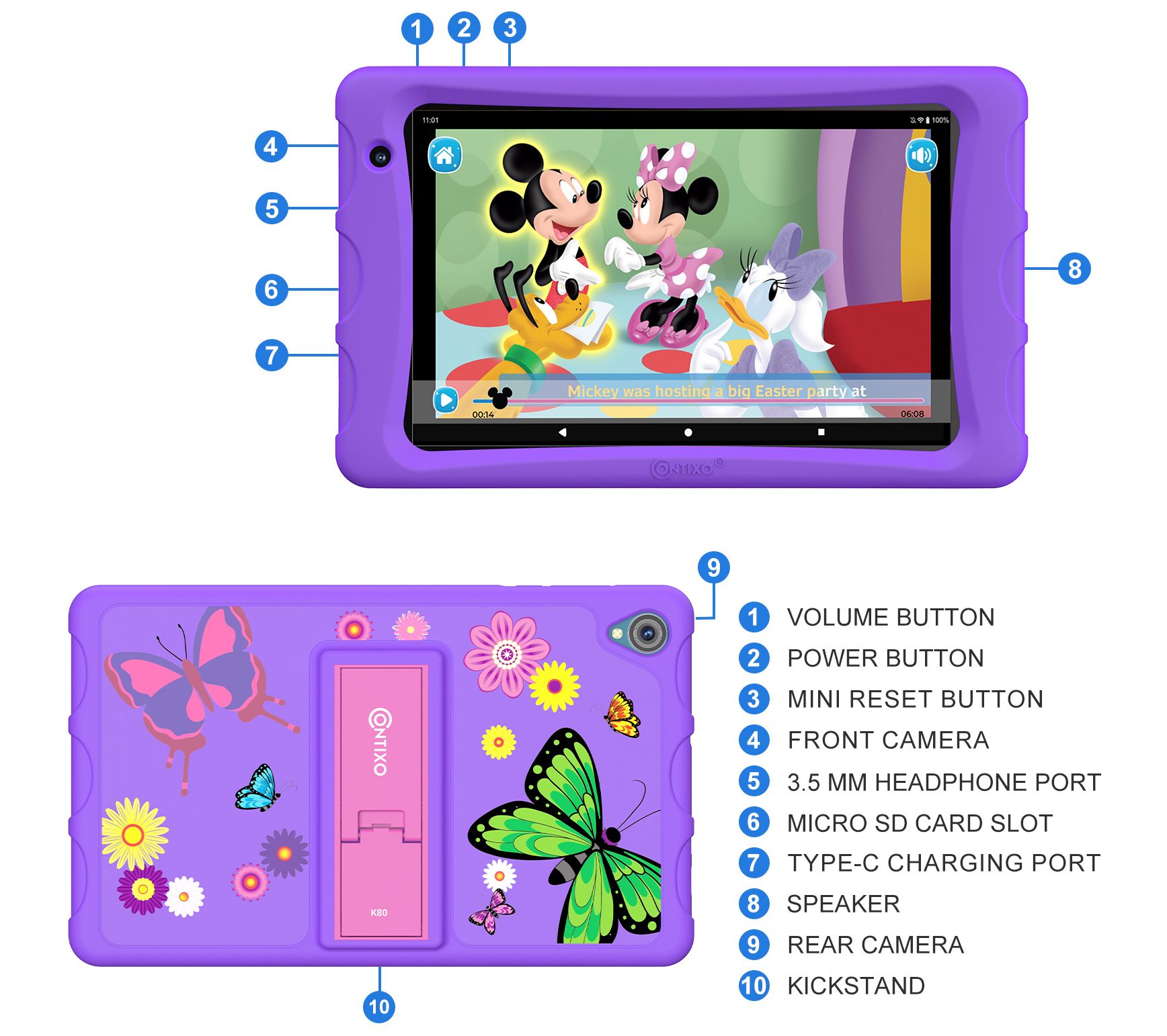 Includes K81 tablet with screen protector, silicone kickstand case, USB Type-C charging cable, 16 Disney cartoon stickers, and manual