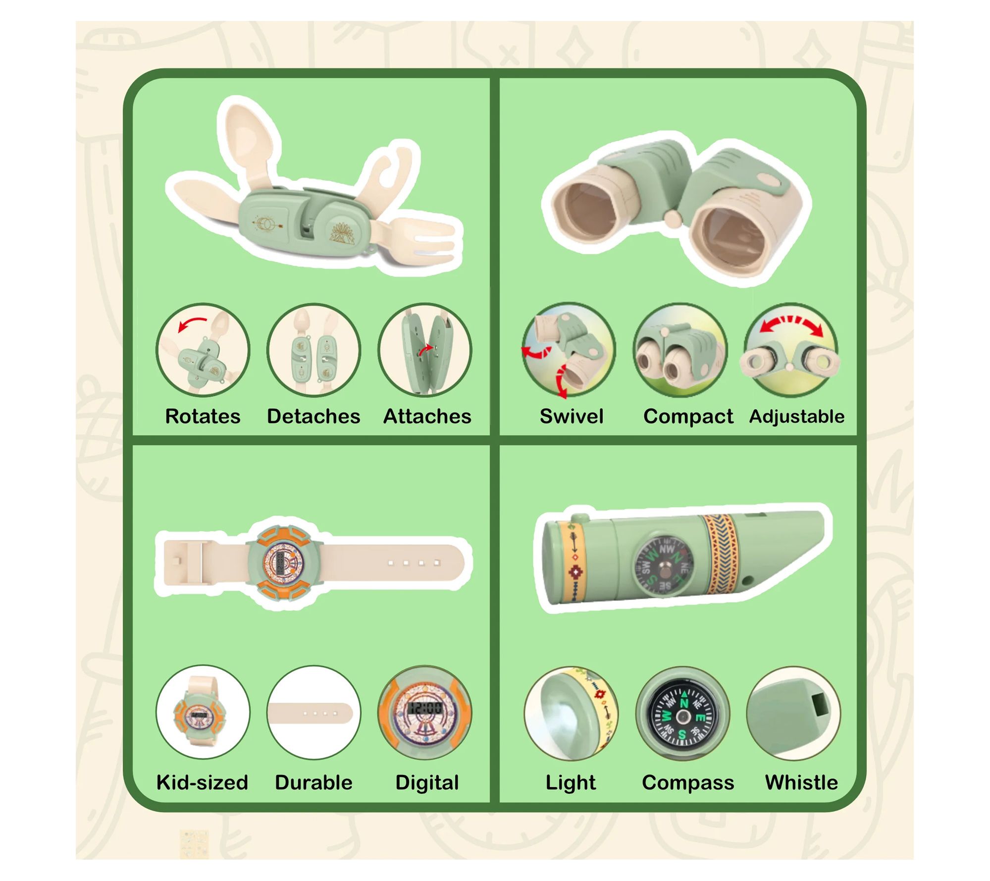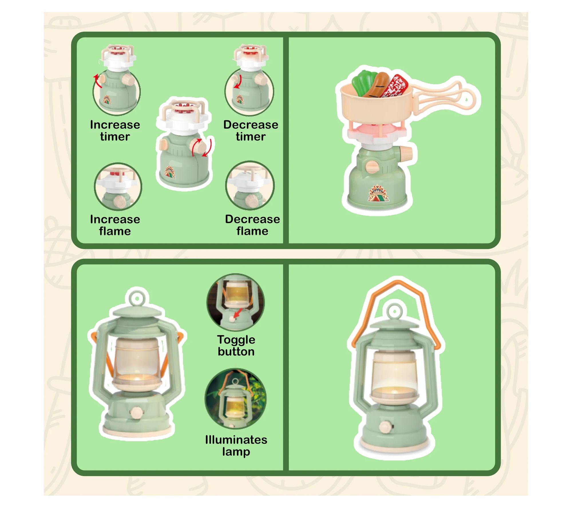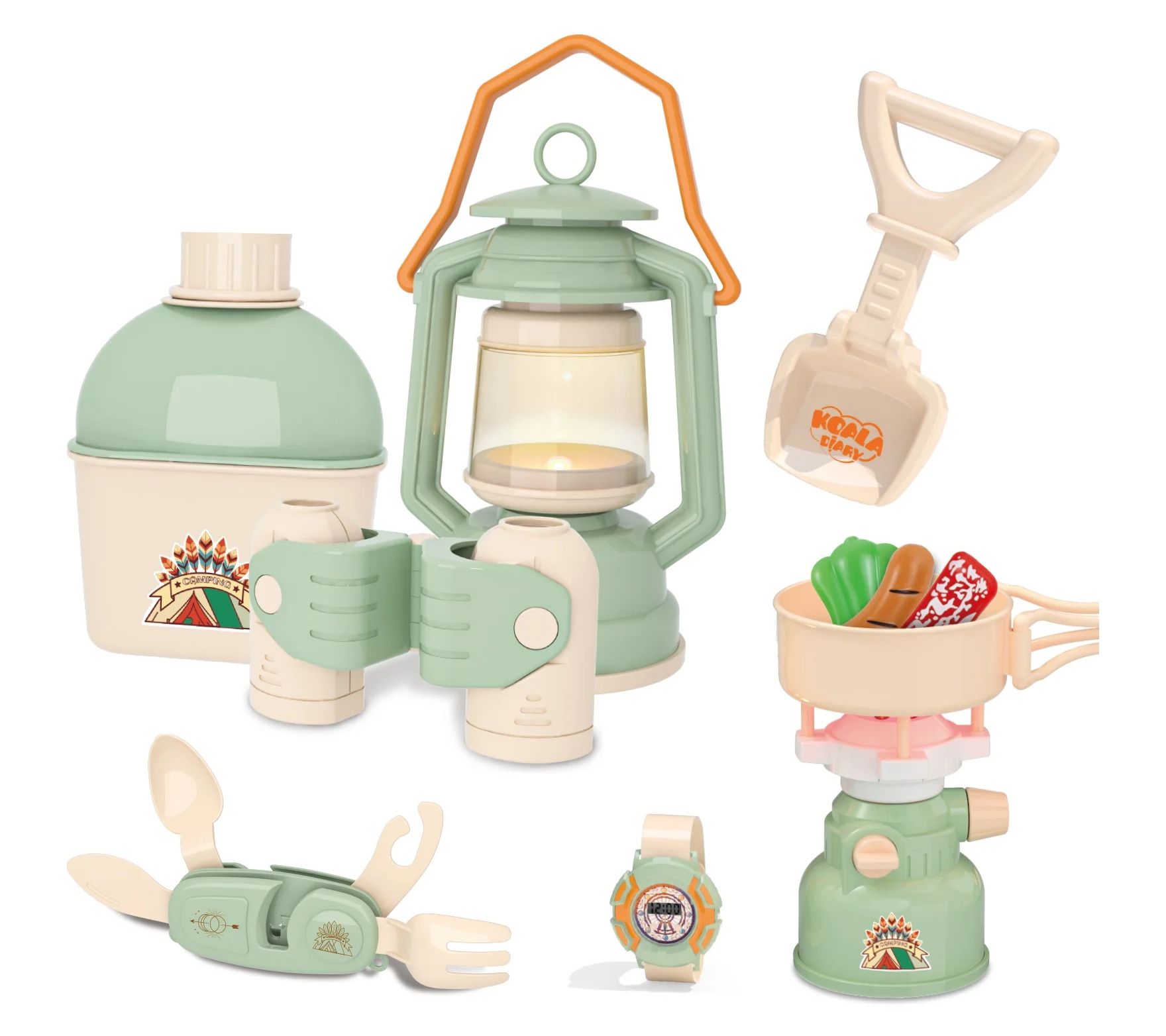 • Includes pop-up play tent, camping pot/pan, lantern, camp stove, binoculars, multi-tool utensil, first aid kit box, whistle, drawstring backpack, canteen, shovel, smartwatch, flashlight, toy foods, plate, and lanyards