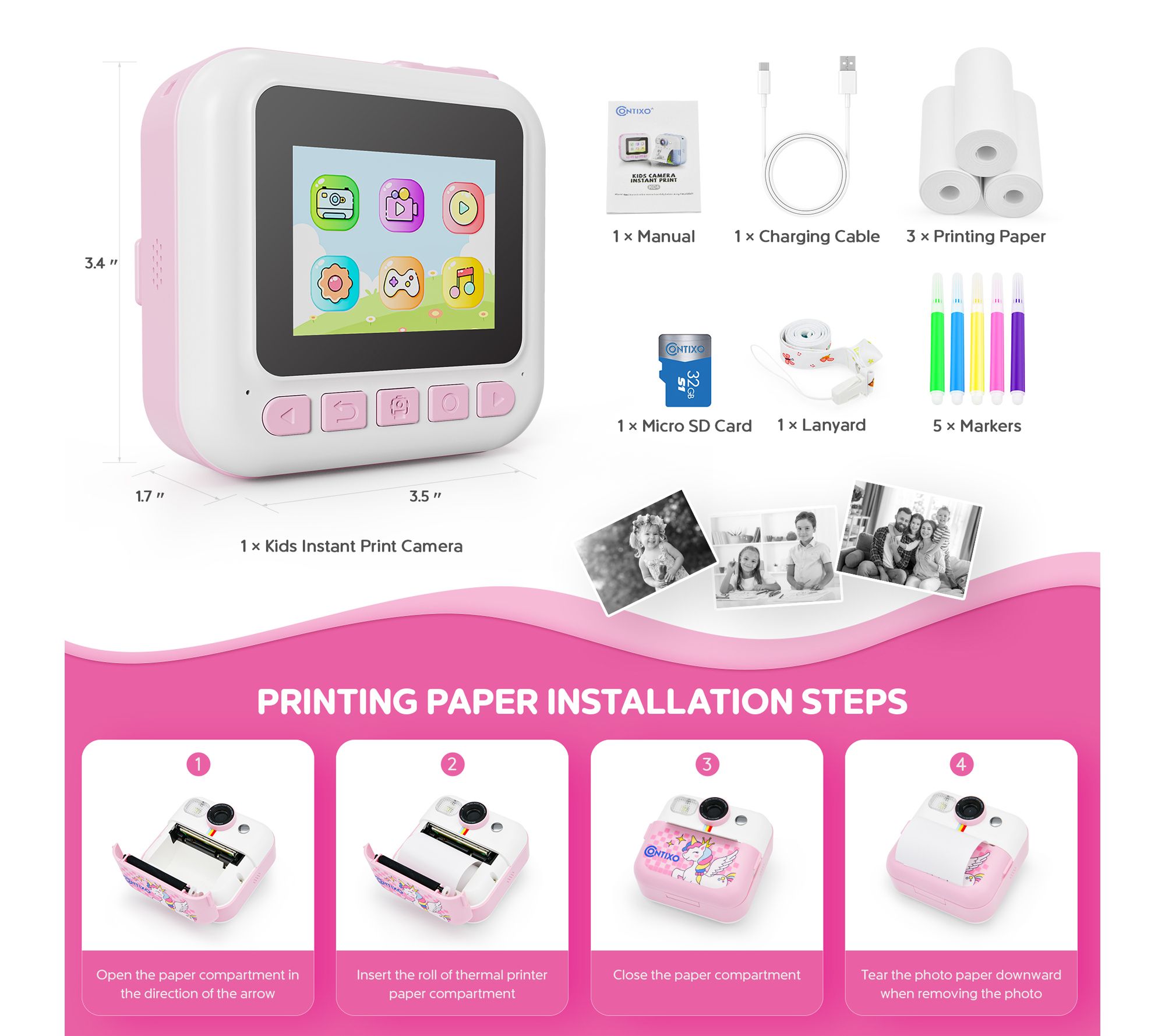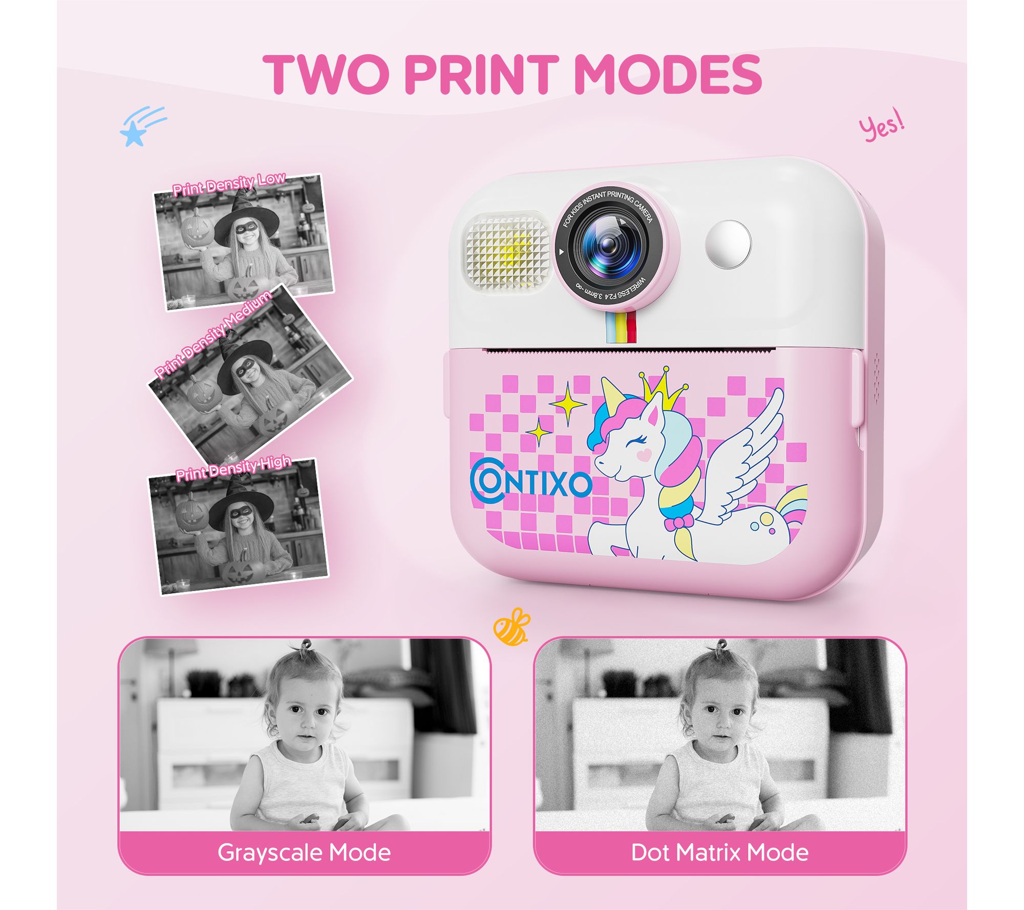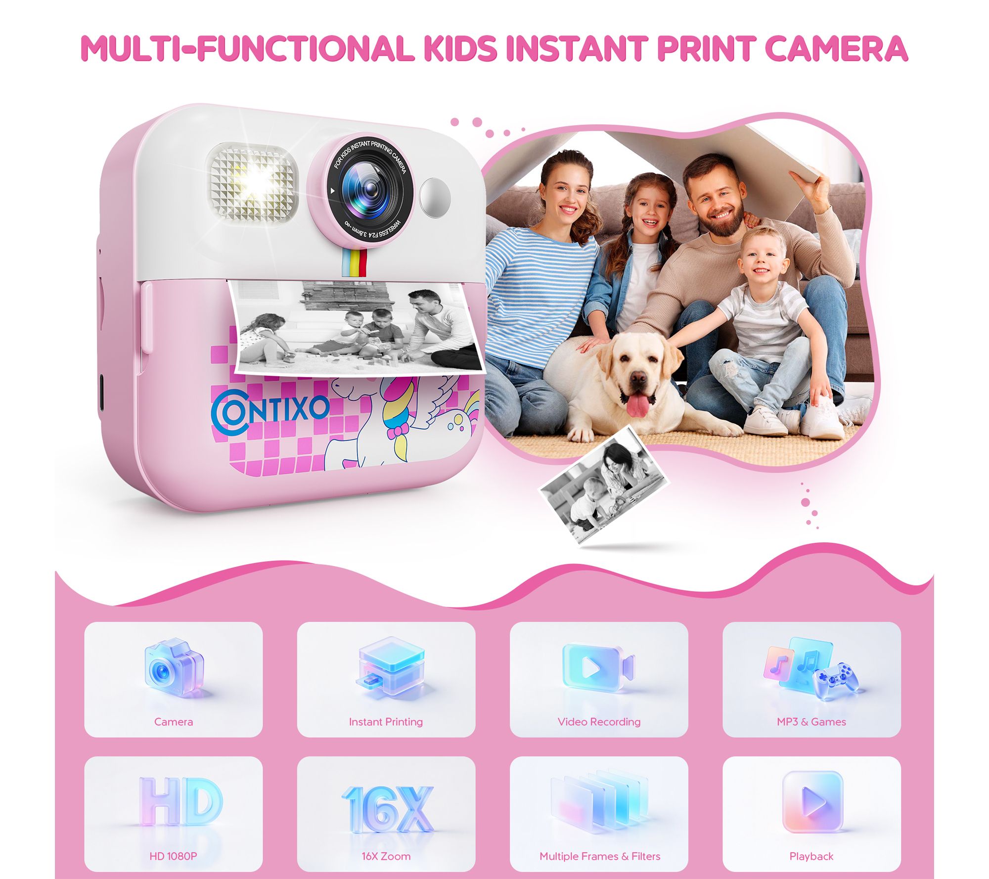 Kids can capture everyday adventures, print photos instantly, and share memories with friends -- all on their own digital instant print camera. Easy controls and soft grips make it ideal for younger hands, while the instant print feature lets moments come to life in seconds. From Contixo.