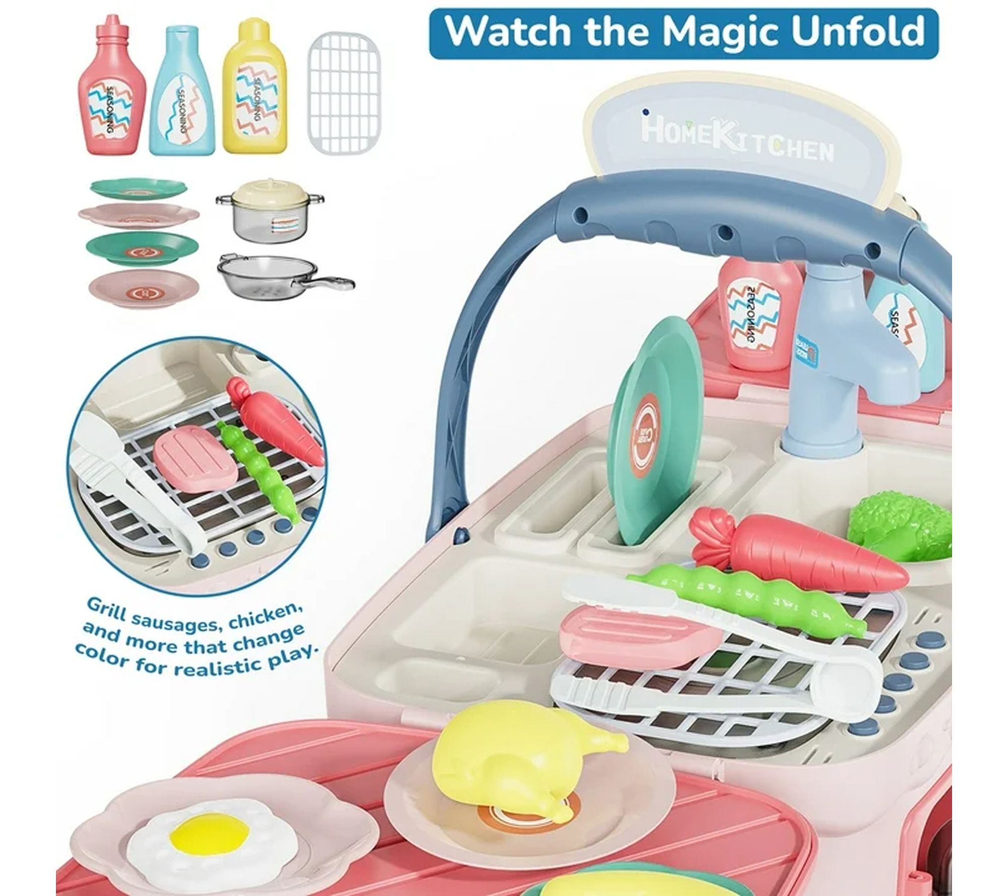 • Color-changing foods: sausages, steak, chicken, and fish change color as they pretend cook