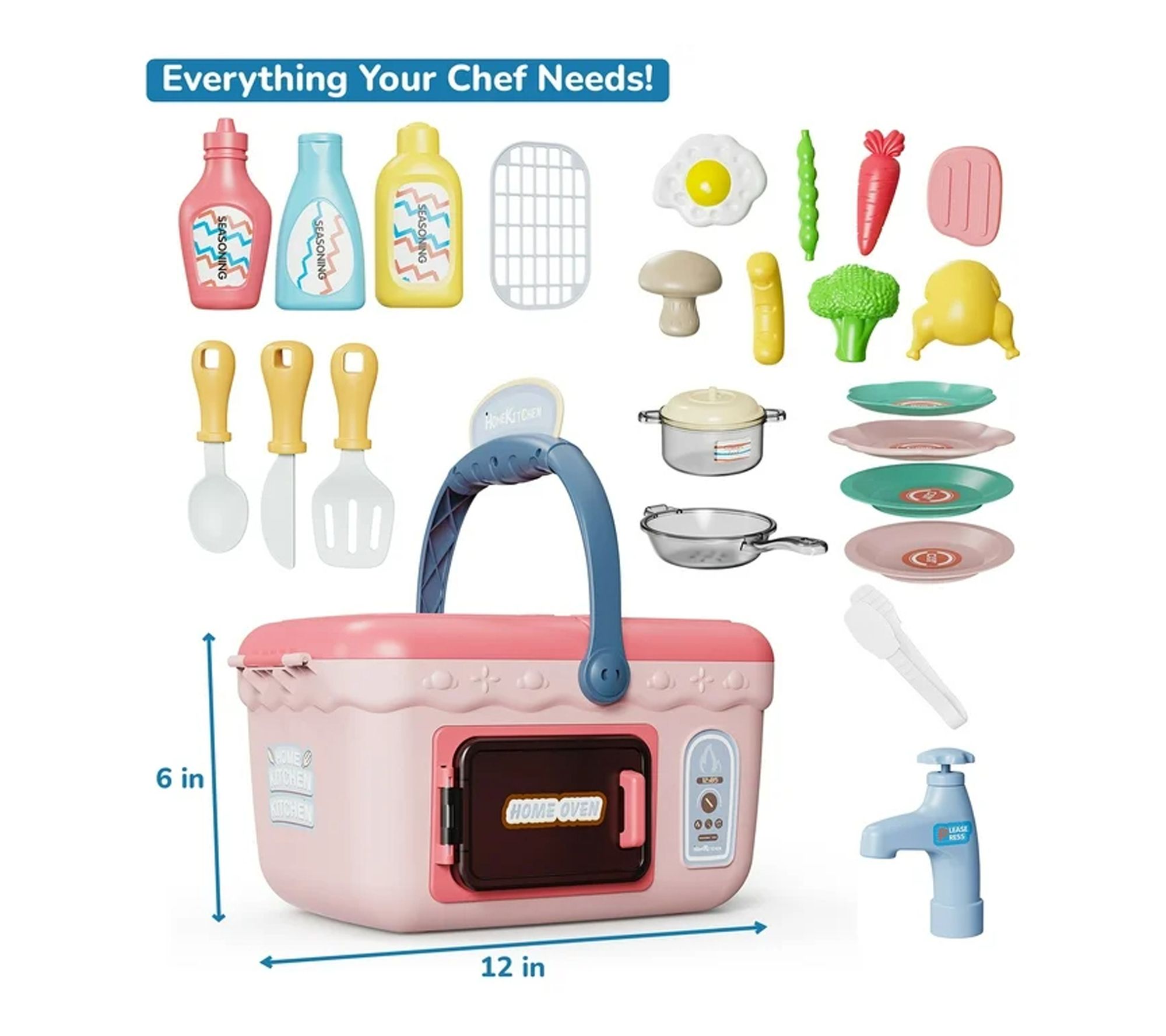 • Includes picnic basket with grill, working sink, pots, pans, utensils, and play food
