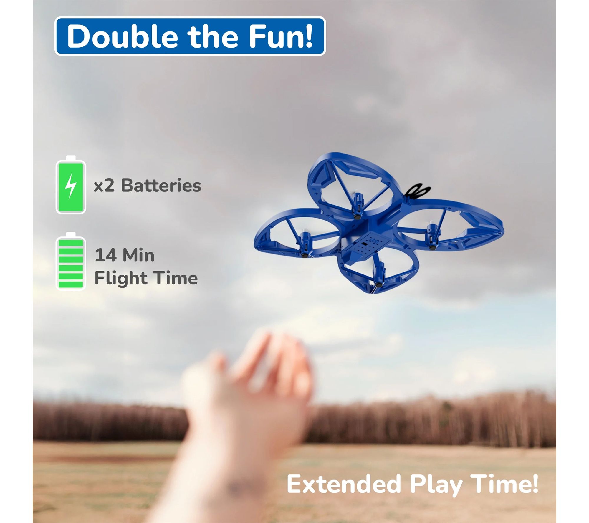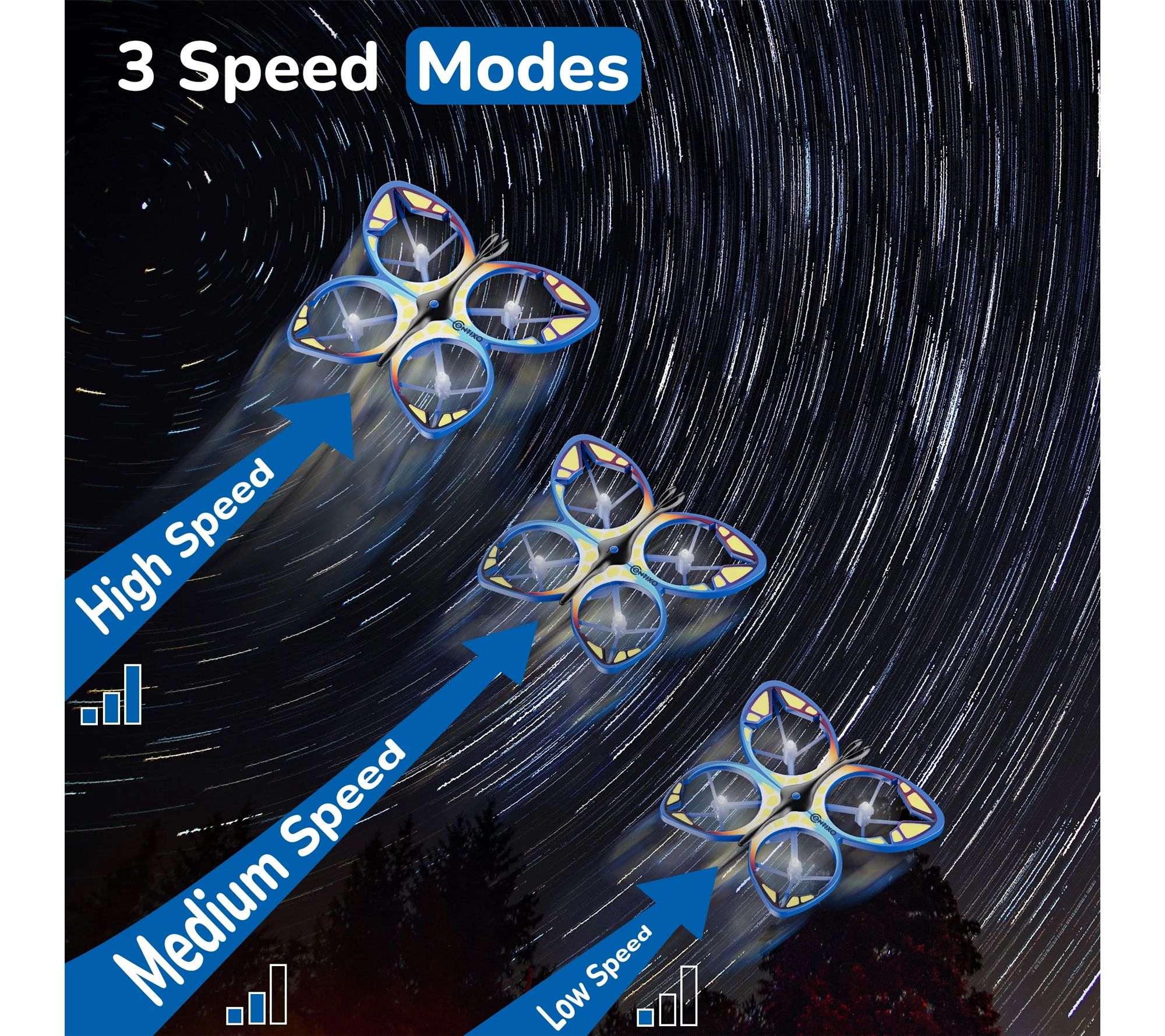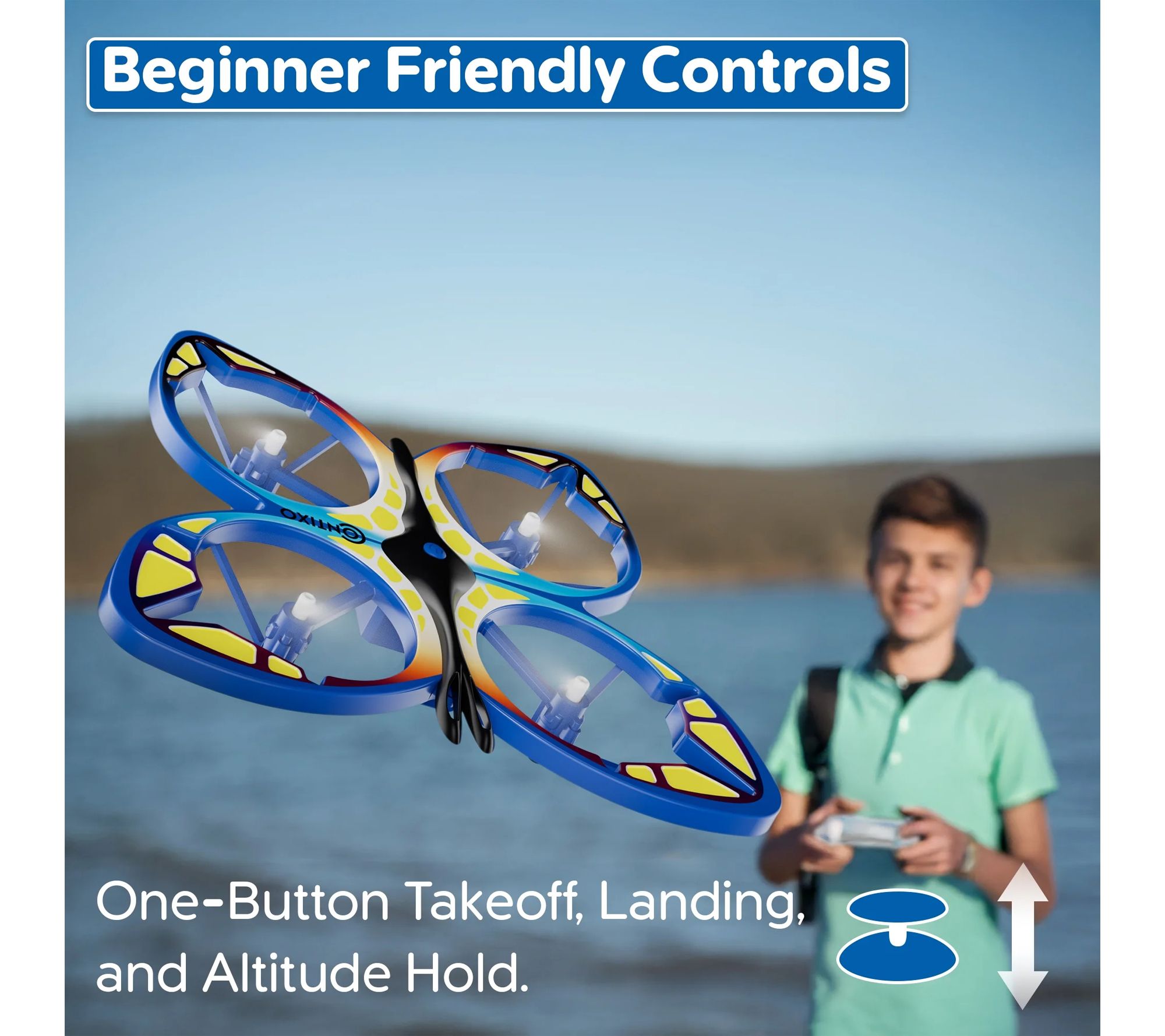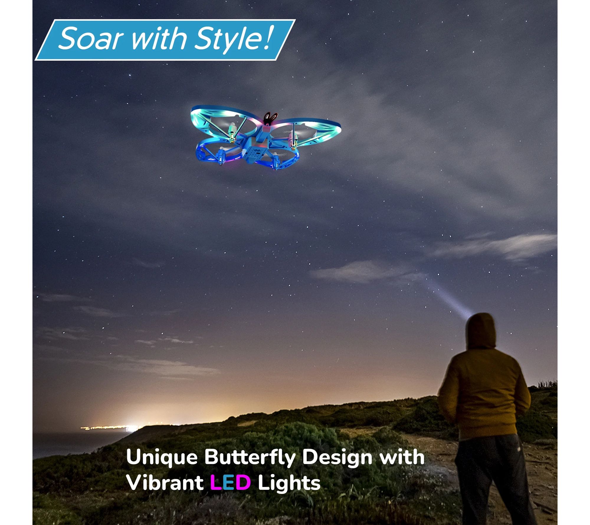Add excitement to playtime with this vibrant butterfly-inspired drone. One-button takeoff, landing, and altitude hold make flying simple for beginners, while adjustable speeds and headless mode support learning and cool aerial stunts. Bright LED lights let kids fly indoors or outdoors, day or night. For longer fun, swap the batteries to double the flying time.