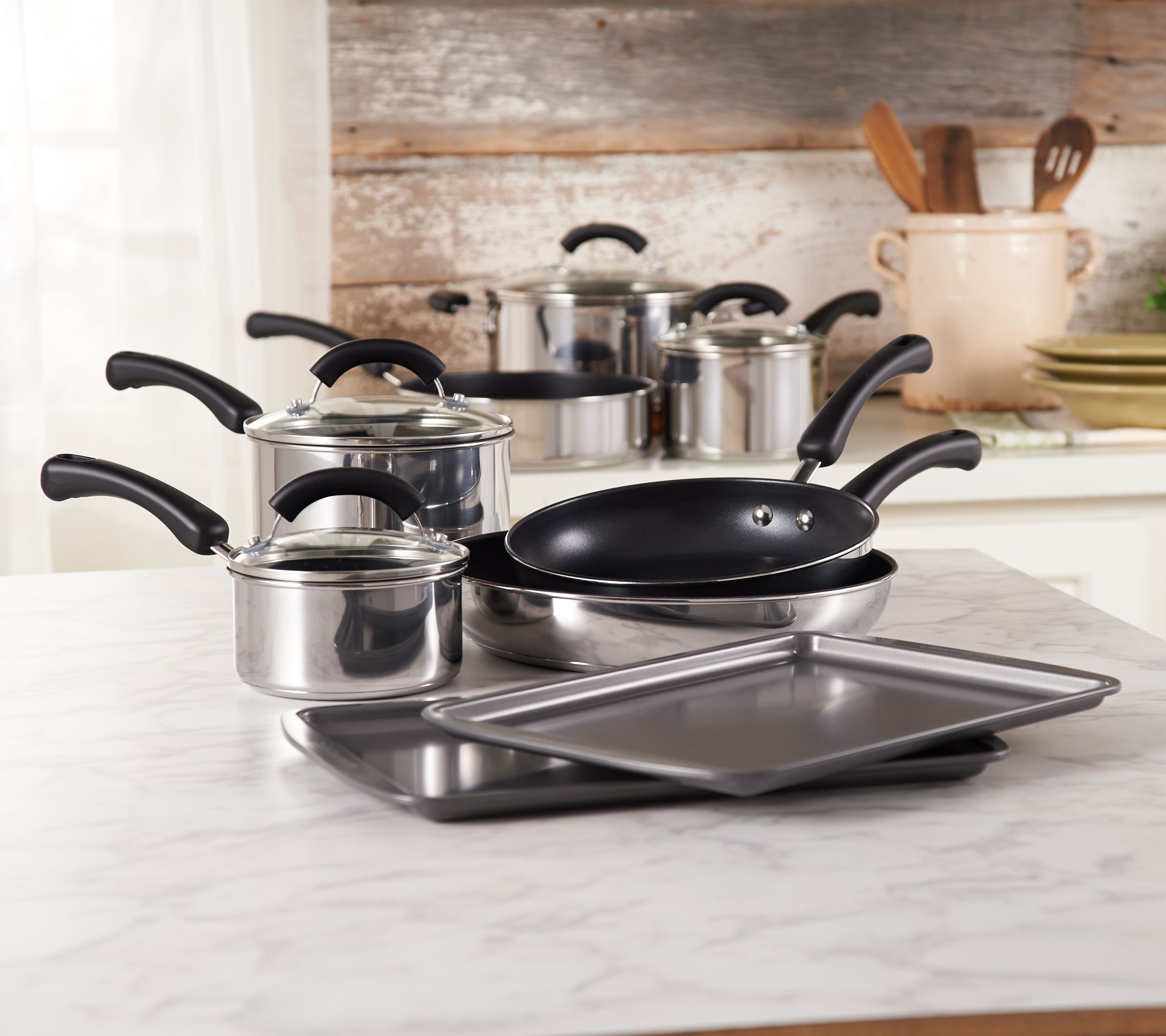 Includes 5-qt Dutch oven with lid, 3-qt sauté pan, 3-qt saucepan with lid, 2-qt saucepan with lid, 1-qt saucepan with lid, 10" skillet, 12" skillet, and two cookie sheets