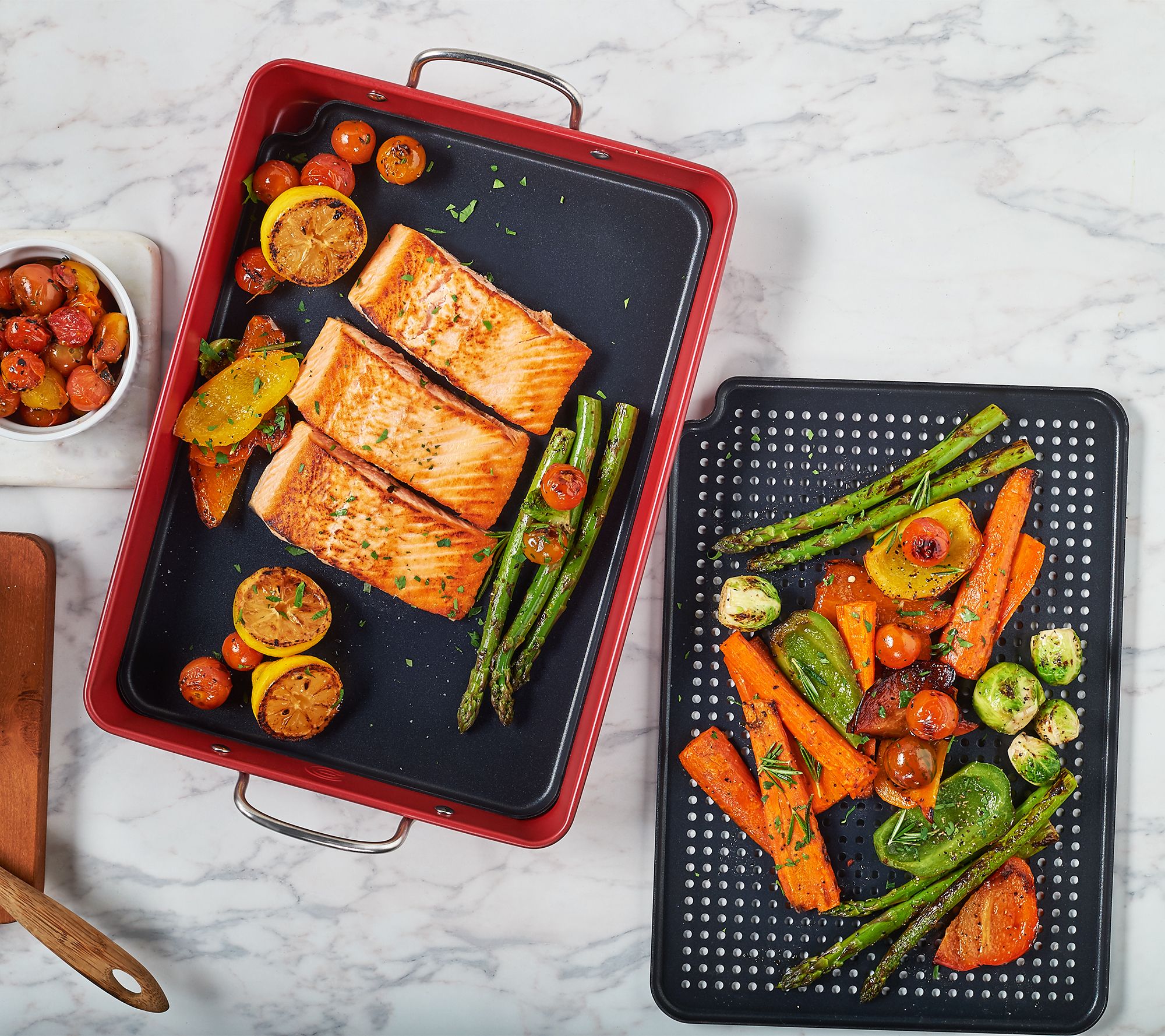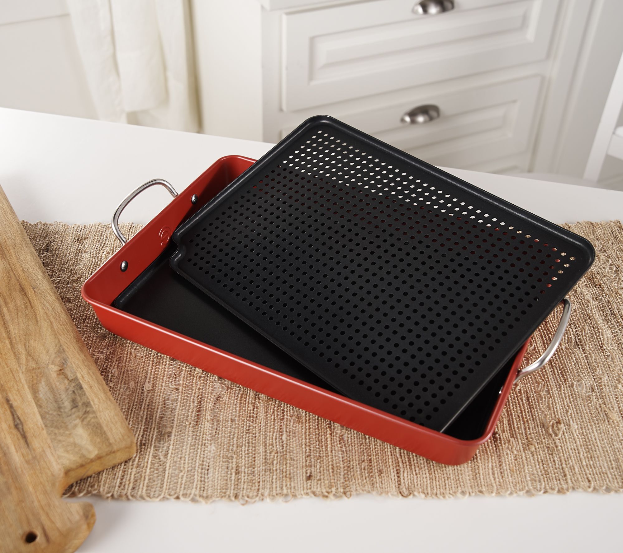 All the joys of grilling--with less mess and lost food. This grill pan is equipped with a perforated insert to keep smaller foods like shrimp and veggies from falling through the cracks, and a griddle insert that makes it easier to whip up some bacon along your cheeseburgers. From Cook's Essentials(R) Kitchenware.