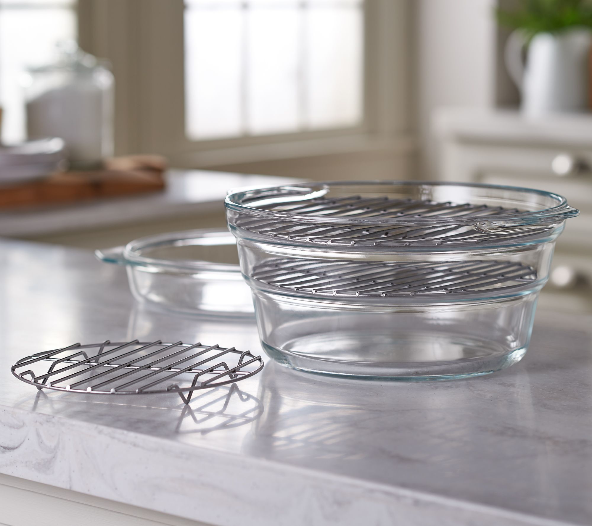 Includes 6-1/4-qt glass Dutch oven, dual-function glass lid, and three stainless steel wire racks