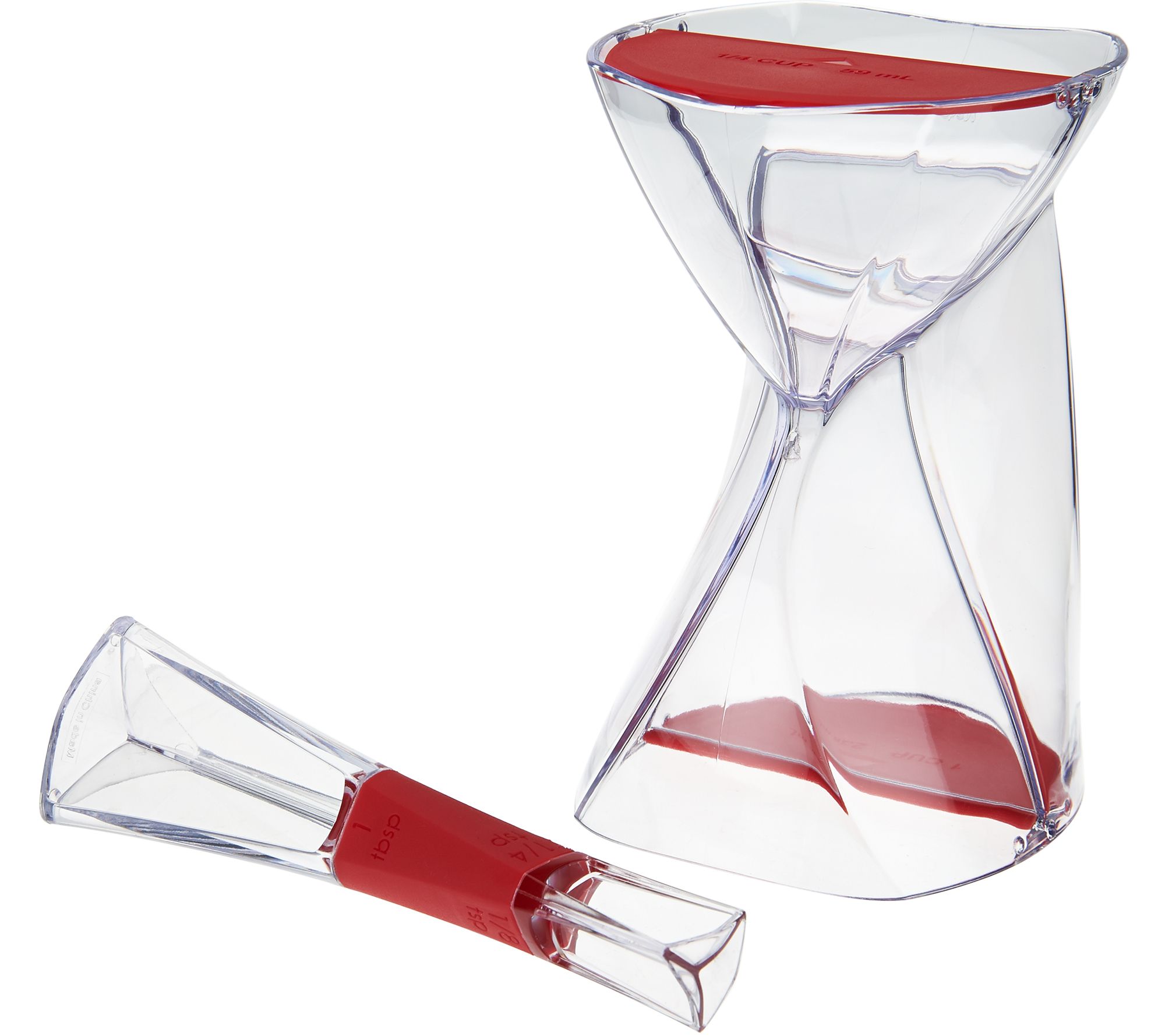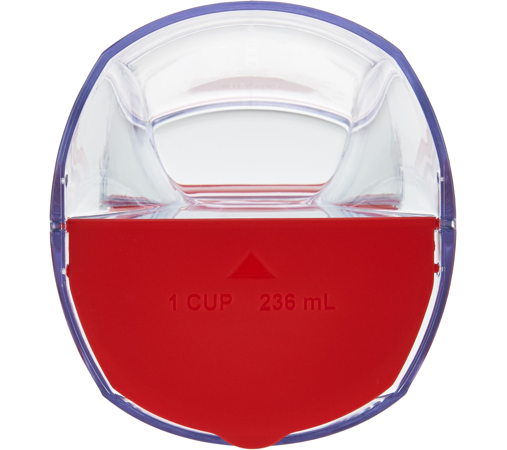 Cup offers four measuring cavities created by flipping the integrated lid: 1/4-cup, 1/3-cup, 1/2-cup and 1-cup