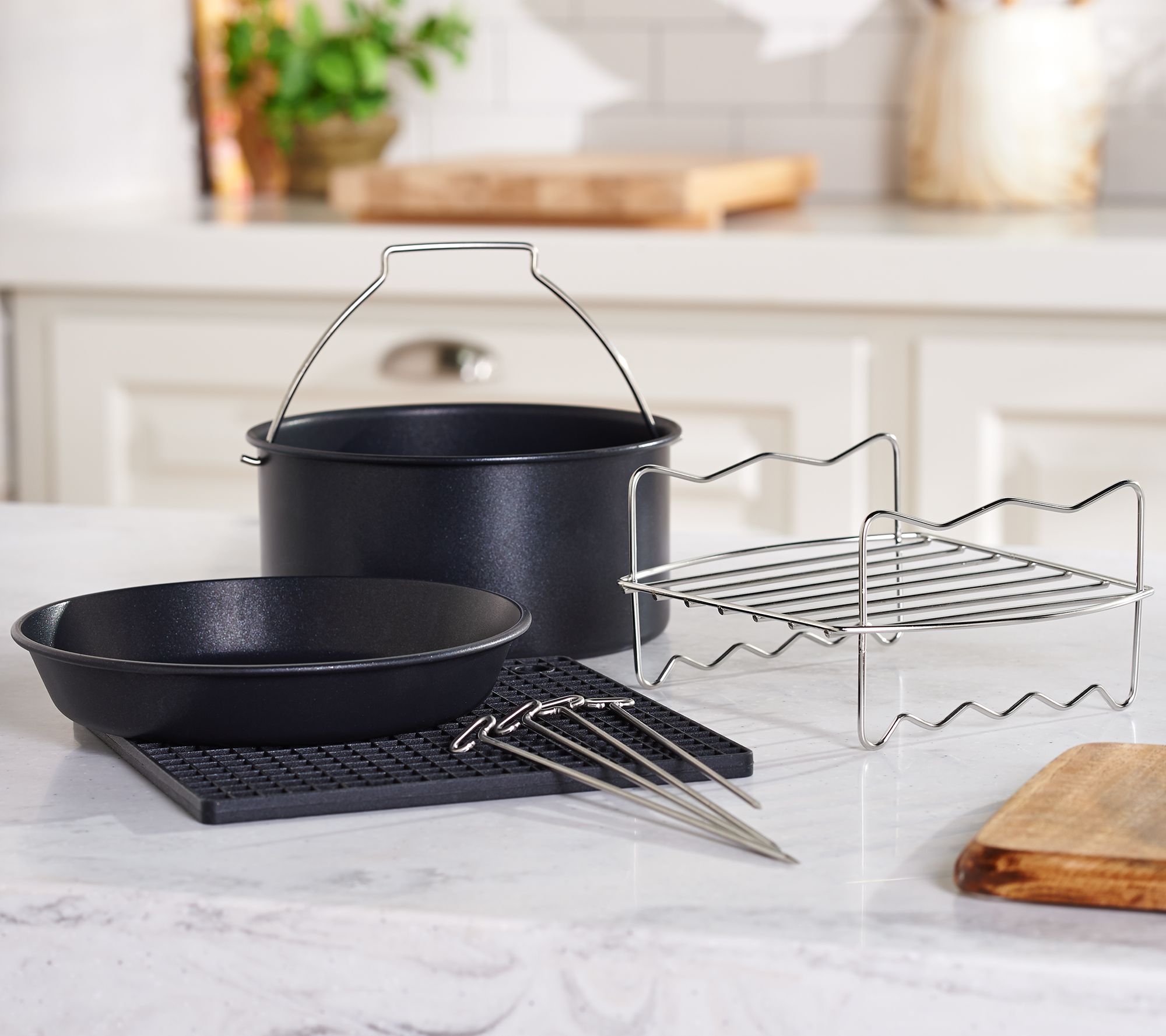 Expand your frying repertoire with this accessory kit for your Cook's Essentials air fryer, featuring a cake pan, pie pan, rack, trivet, and four skewers. From Cook's Essentials(R) Kitchenware.