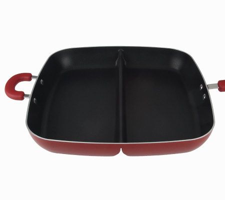Bacon and eggs. Meat and potatoes. Hot dogs and baked beans. With this divided skillet, you can prepare your favorite pairs in the same dish. The Belgian shaped body boasts a clear-coated porcelain enamel exterior for add durability and luster. And the nonstick interior coating makes cleanup a cinch. From Cook's Essentials(R) Kitchenware.